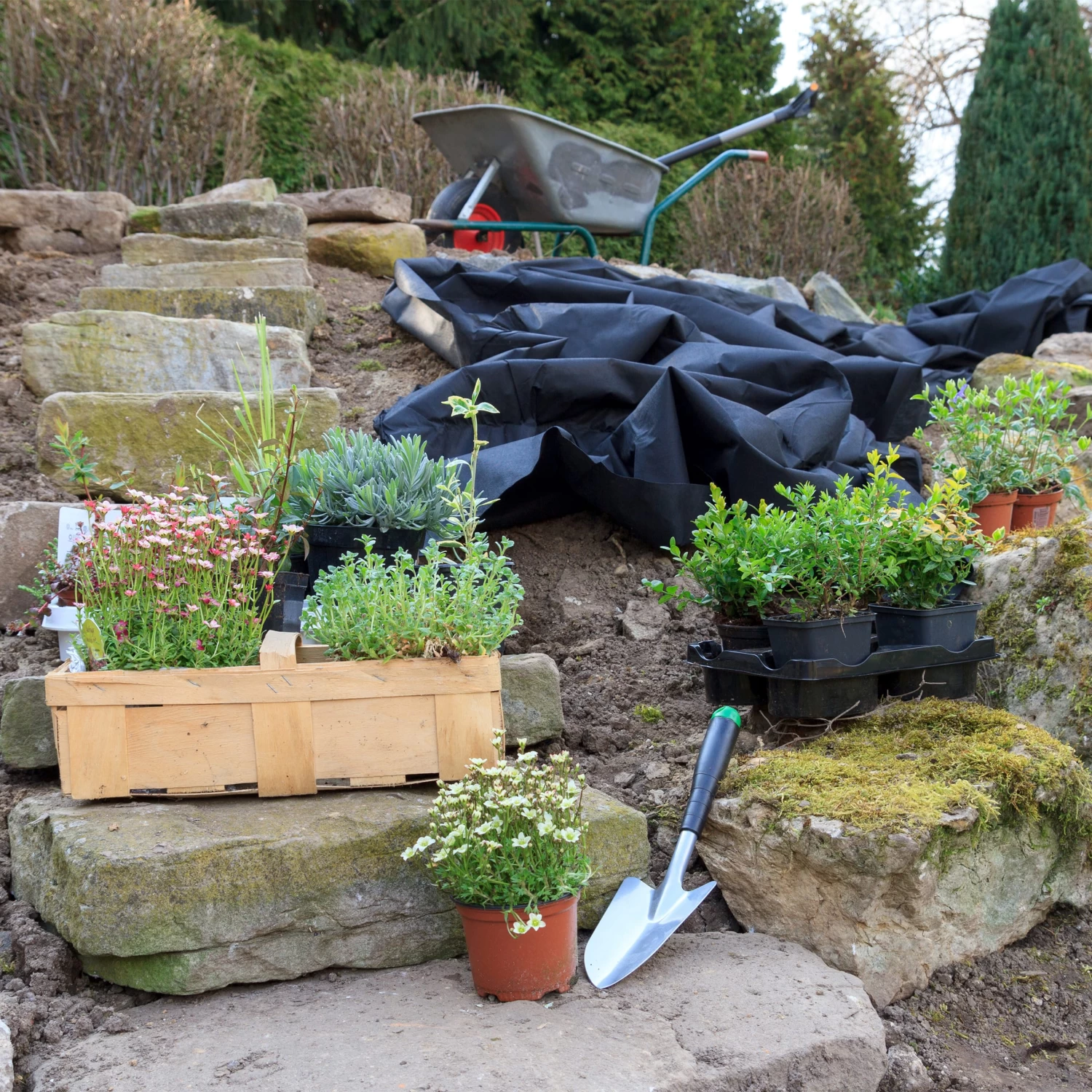 – Vlies vollständig mit Rindenmulch, Sand, Kieselsteinen o. Ä. bedecken