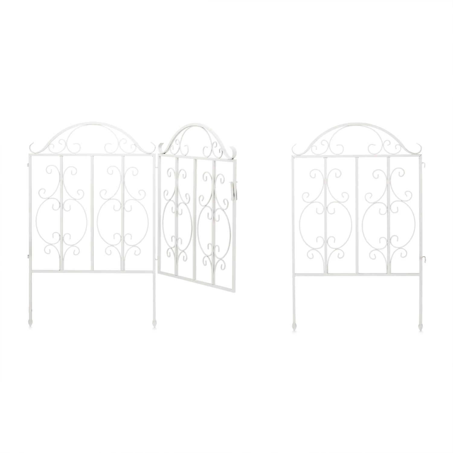 Verleihen Sie Ihrem Garten den letzten Schliff mit diesem dekorativen Gartentor aus Stahl. Die verzierte Gartenpforte besteht aus drei Teilen: Zwei Zaunelementen und einer Flügeltür. Die Segmente sind über ein steckbares Scharnier miteinander verbunden und können so mit anderen Zaunelementen erweitert werden. Die Gartentür besticht mit ihren geschwungenen Ornamenten und verziert Ihren Garten auf elegante Art. Zur Installation stecken Sie die Gartentor-Elemente einfach direkt in den Boden.