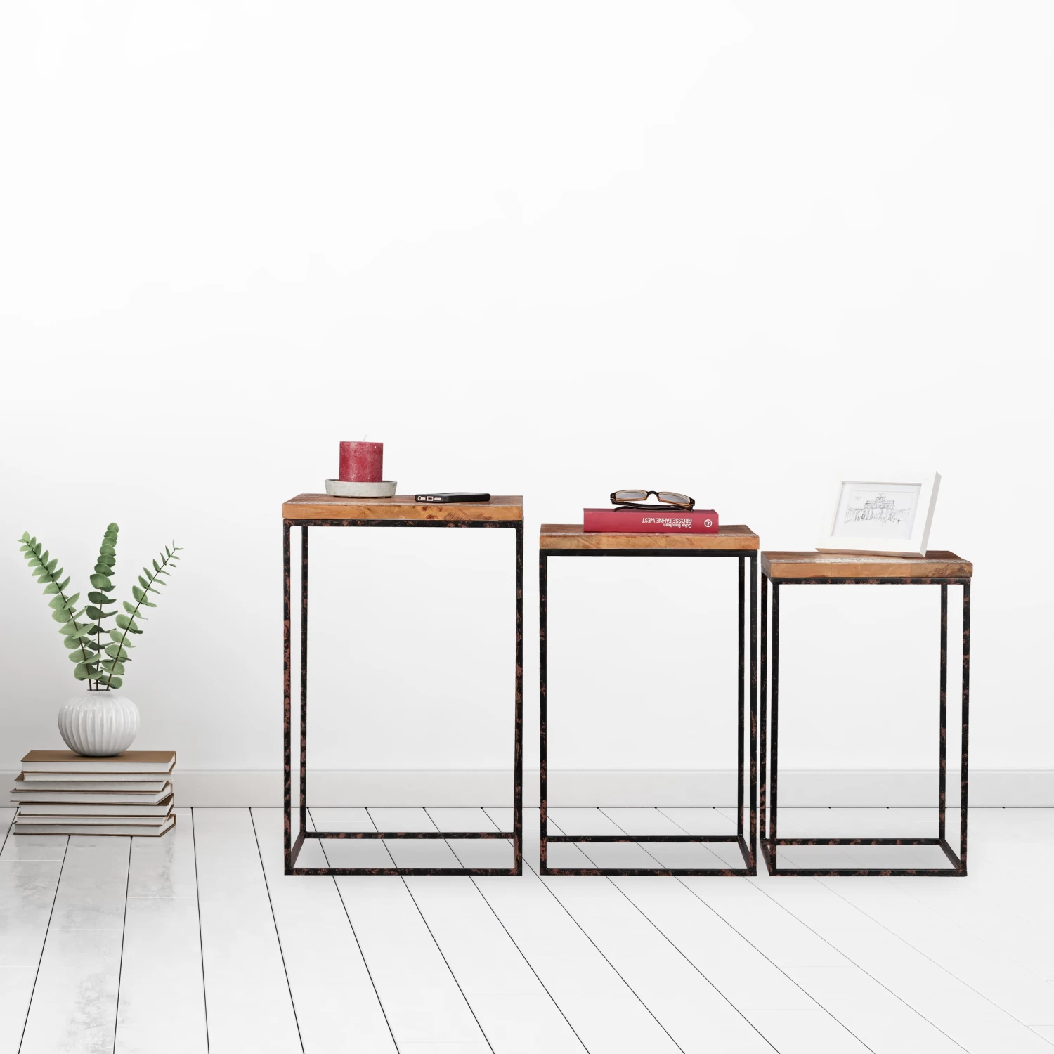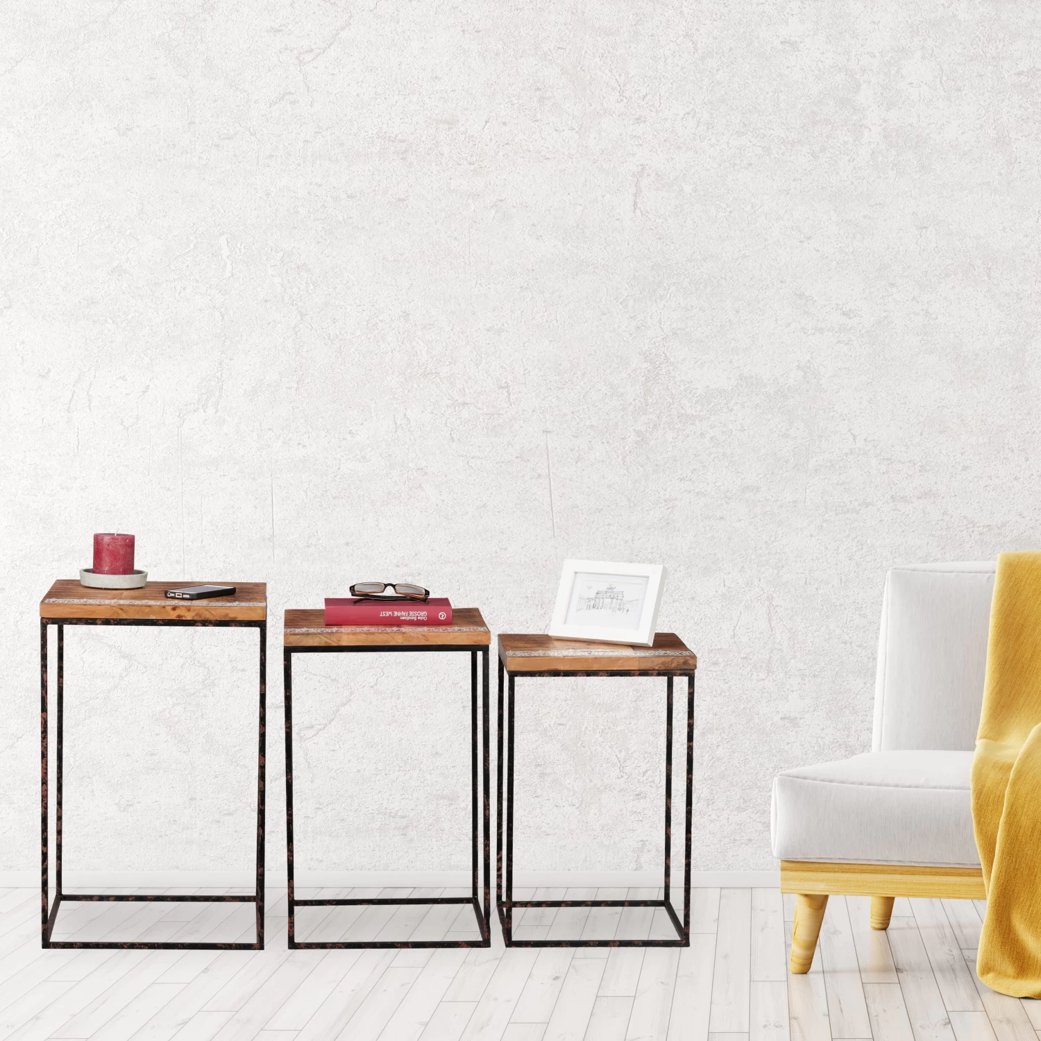 Dabei passen sich die Satztische durch den Materialmix in viele Wohnstile ein. Die Holzmaserung mit dem weißen Bordüren-Muster passt zu natürlichen Einrichtungsstilen. Dank des Metallgestells fügen sich die Tische auch in Loftwohnungen im Industrial Stil unkompliziert ein.