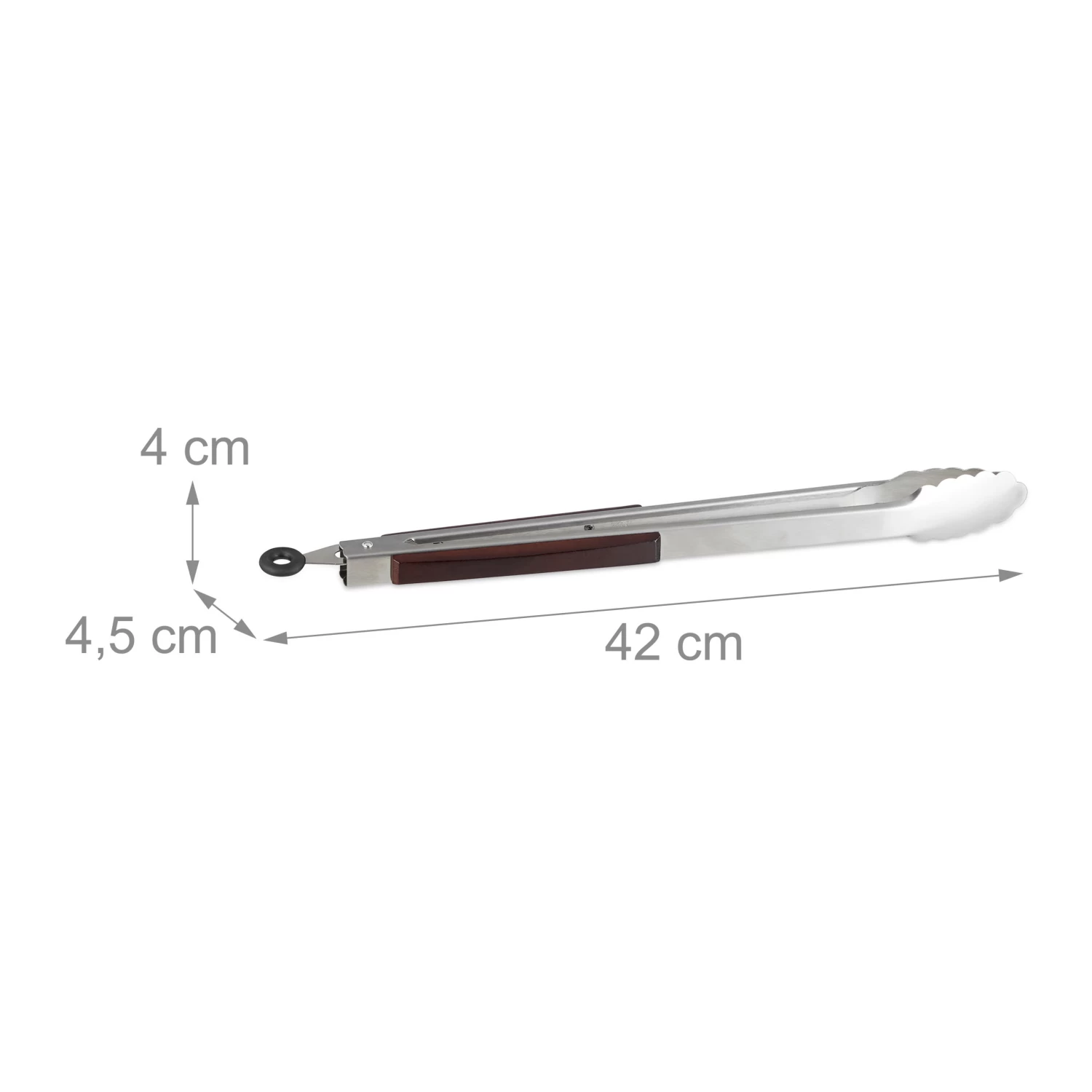 Die Grillsaison kann kommen! Mit der Küchenzange aus Edelstahl sind Sie bestens gerüstet, Steaks, Würstchen und Grillkäse wie ein Profi zu wenden und zu servieren. Die lange Grillzange sorgt für einen ausreichenden Sicherheitsabstand zwischen Ihnen und dem Rost und beugt so Verletzungen vor. Dank Holzaufsatz haben Sie die Zange fest im Griff. Die einfache Handhabung und der Zangenkopf mit runden Zähnen sorgen wiederum dafür, dass Sie Ihr Grillgut bestens im Griff haben.