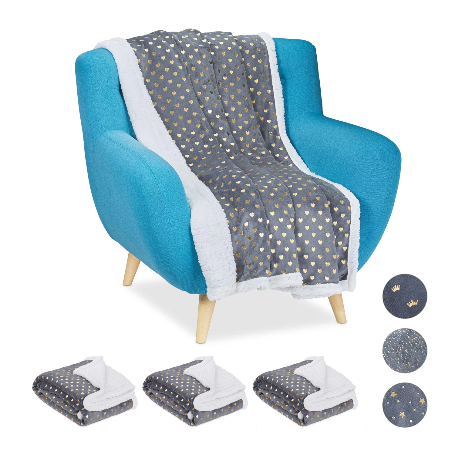 Was gibt es in der kalten Jahreszeit Besseres, als sich nach einem langen Arbeitstag mit einer Tasse Tee oder einer heißen Schokolade auf der Couch einzukuscheln? Die flauschige Wohndecke in Grau mit dekorativen goldenen Prints ist da genau das richtige Accessoire. Mit ihrer Unterseite in weißer Lammfelloptik spendet sie angenehme Wärme und sorgt für behagliche Gemütlichkeit. Auch für laue Sommerabende auf der Terrasse oder gemeinsame Abende unter dem Sternenhimmel ist die Flauschdecke ideal.