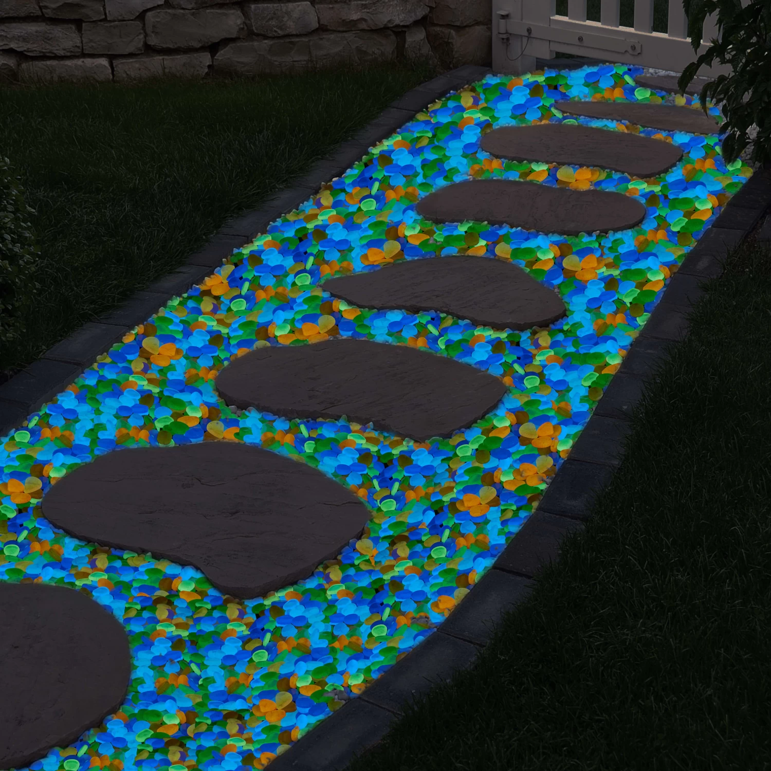 Dieses 400er Set Dekosteine ist vor allem im Dunkeln ein echter Hingucker. Tagsüber absorbieren die Ziersteine das Sonnenlicht und fangen nachts an zu leuchten. So haben Sie ein schönes Lichtspiel für Haus und Garten – und das gänzlich ohne Strom. Die Zierkiesel machen vor allem auf Gehwegen oder Beeten eine tolle Figur, sind aber auch drinnen ein dekorativer Blickfang. Verschönern Sie ganz einfach Vasen, Dekoschalen und Blumentöpfe oder auch das Aquarium mit den kleinen leuchtenden Steinen.