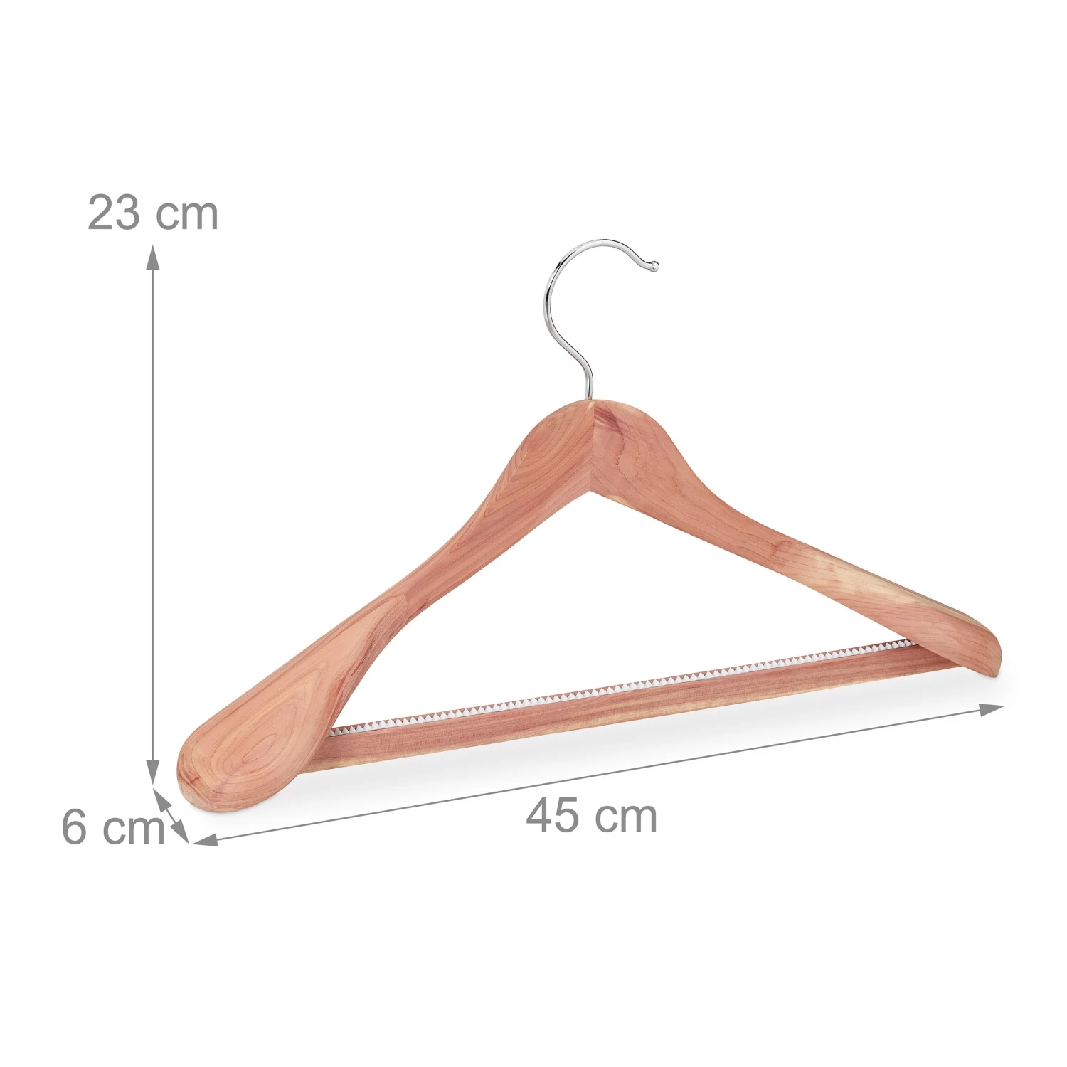Mithilfe unseres Bügel-Sets schaffen Sie Ordnung und einen einheitlichen Look im Kleiderschrank. Besonders zum Aufhängen von Anzügen und schweren Jacken sind die breiten Sakkobügel mit Hosenstange bestens geeignet. Die stabilen Blusenbügel sind aus Zedernholz gefertigt, welches durch seinen angenehmen Duft einen natürlichen Mottenschutz bildet. Dabei sollten die Bügel aller 3-6 Monate mit feinem Sandpapier geschliffen werden, um den Geruch und somit den Anti-Motten Effekt zu erhalten.