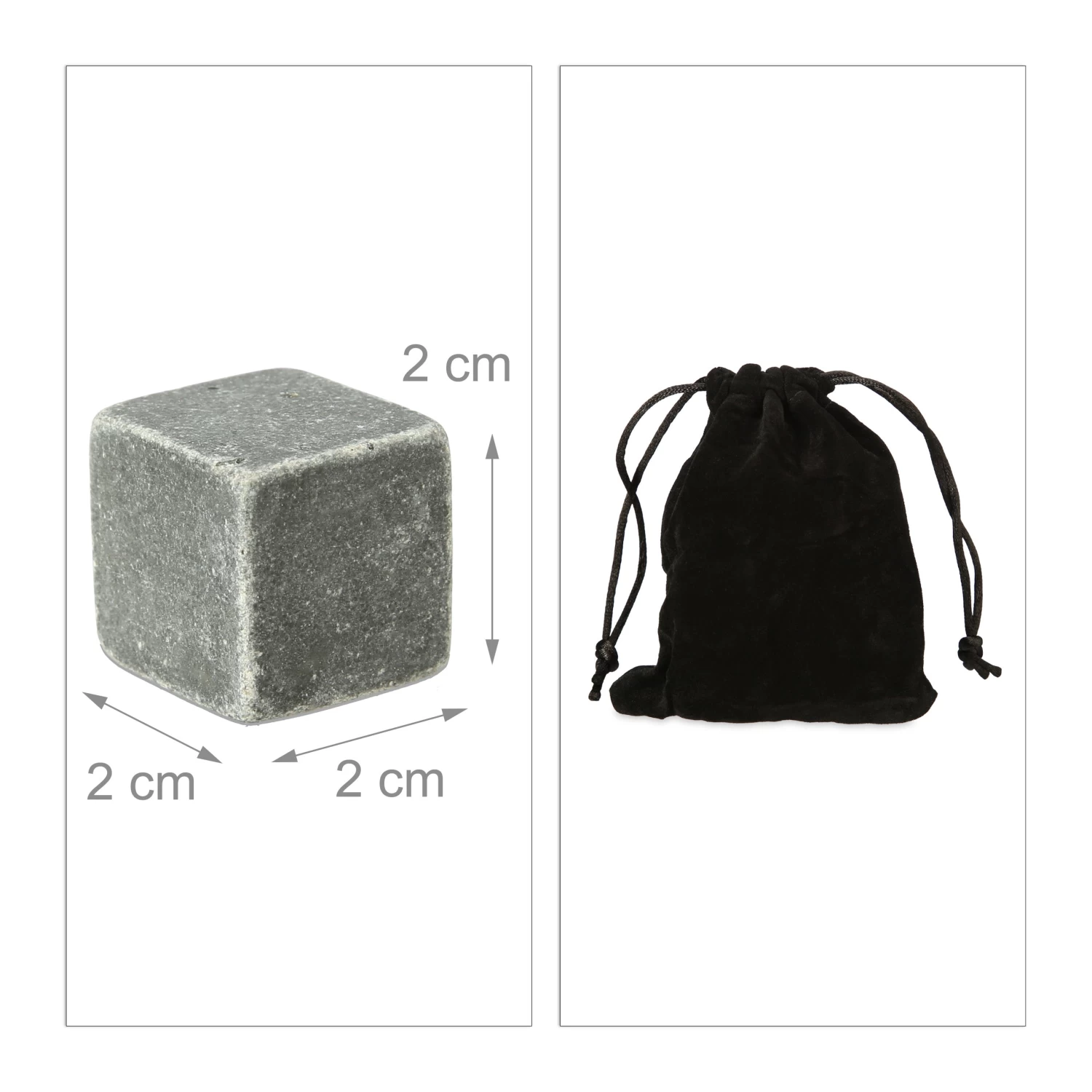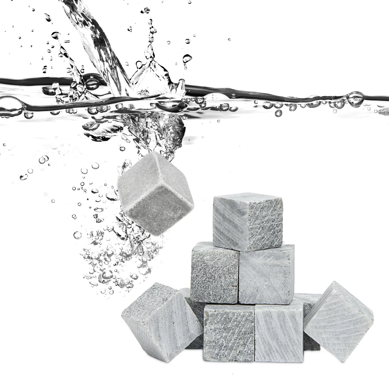Diese Kühlsteine aus Speckstein eignen sich besonders für Liebhaber anspruchsvoller Getränke. Herkömmliche Eiswürfel kühlen Flüssigkeiten nicht langanhaltend und verdünnen sie durch ihr Tauwasser. Die Eiswürfel aus Stein sind aufgrund ihrer natürlichen Eigenschaften toll geeignet als Speicher von Temperaturen. Kontinuierlich geben sie Kälte an den Drink ab, ohne diesen dabei zu verwässern und so den Geschmack und die Textur zu verändern.
