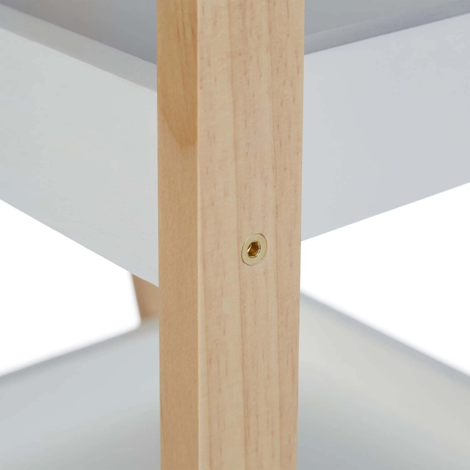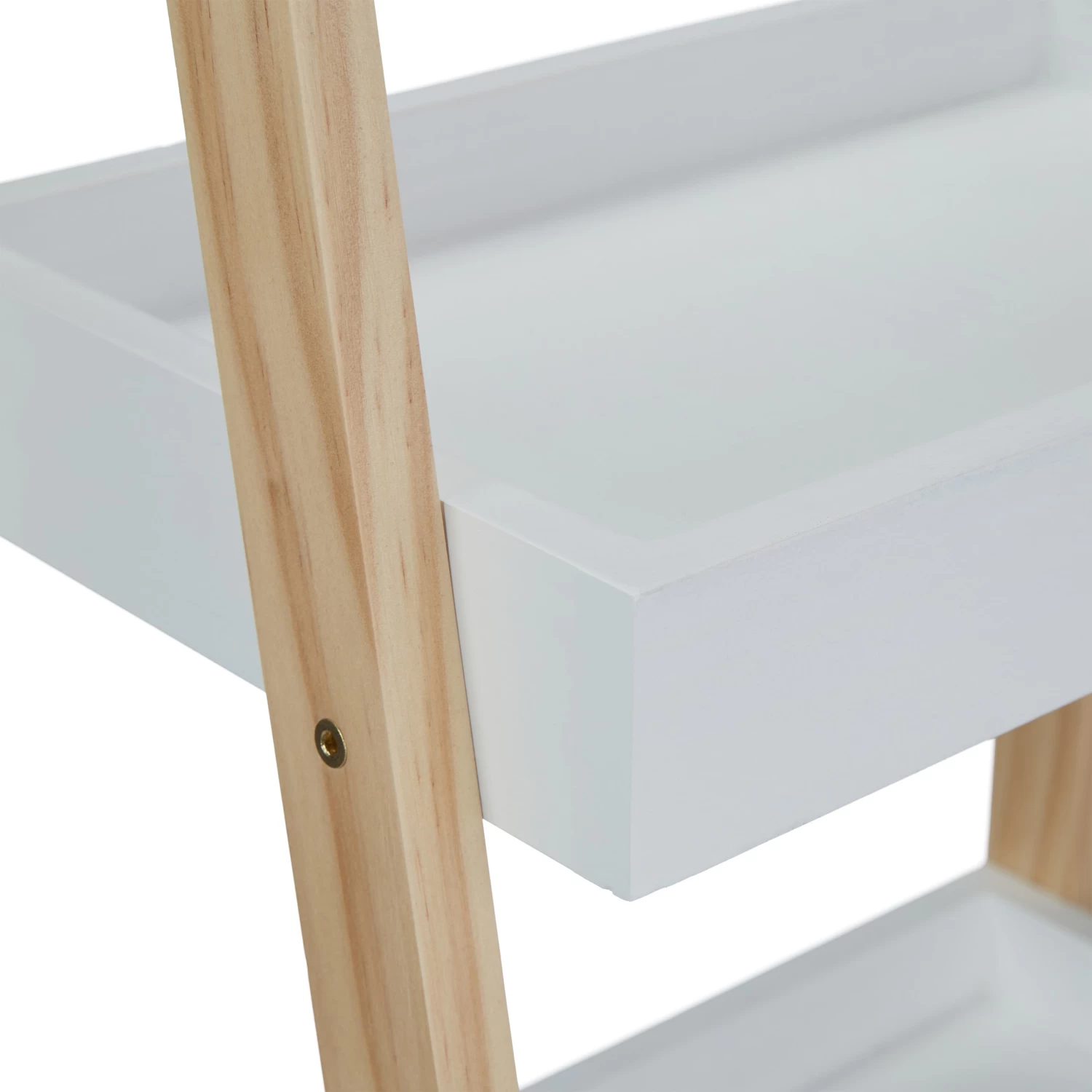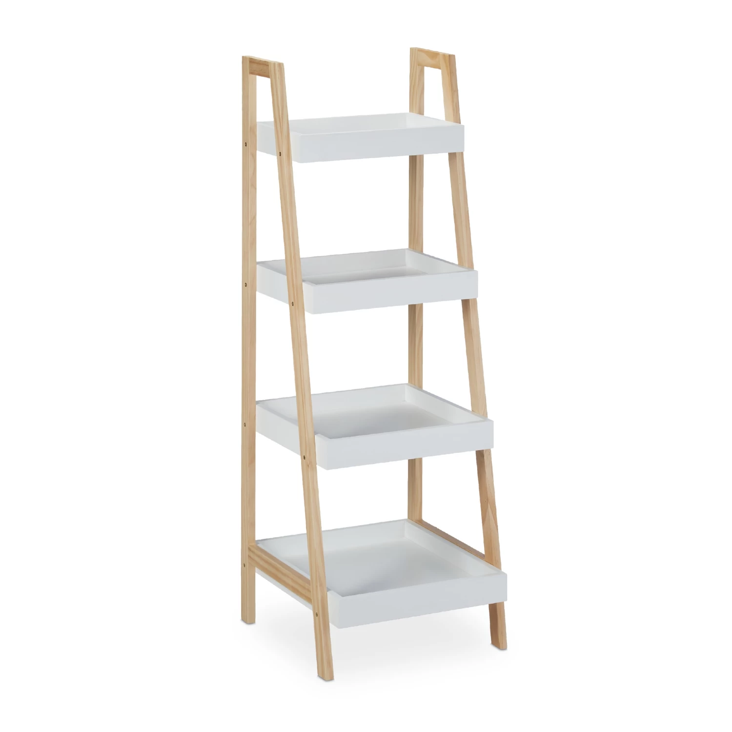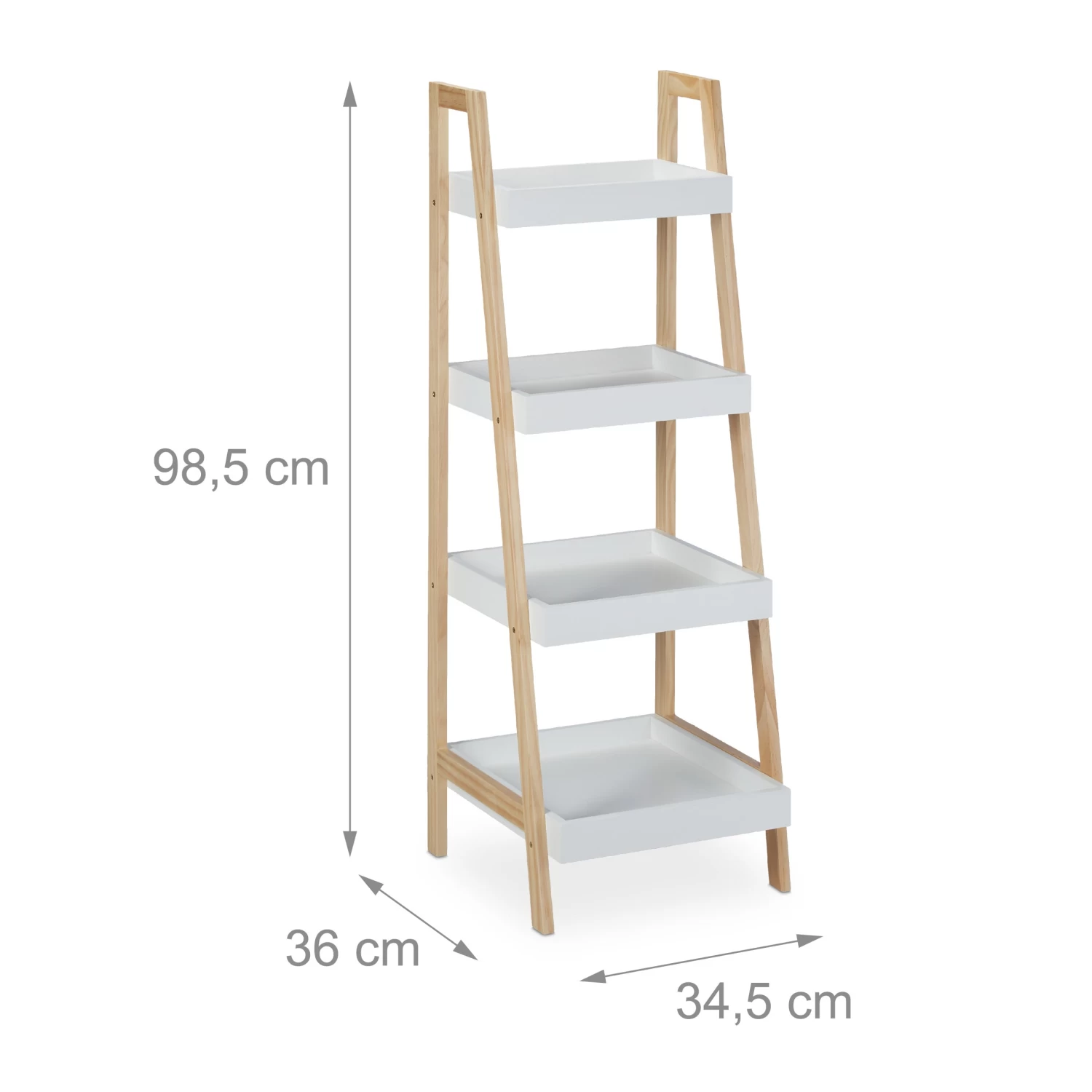 Das moderne Standregal verfügt über ausreichend Stauraum für Badutensilien aller Art, die auf den 4 offenen Ablagen unterschiedlicher Tiefe stets griffbereit lagern. Mit seiner kompakten Größe ist das Treppenregal dabei auch für kleinere Ecken oder Bäder bestens geeignet. Das minimalistische, schlichte Design des Beistellregals wird durch den skandinavischen Look in Weiß- und Naturtönen optisch aufgewertet, sodass sich das Ablageregal auch in Küche, Flur oder Kinderzimmer dekorativ einfügt.