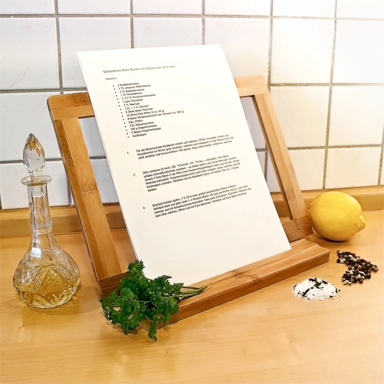 Der praktische Kochbuchhalter ist aus natürlichem Bambus hergestellt und hält Ihre Rezepte an Ort und Stelle. Er ist nicht nur extrem nützlich beim Backen und Kochen, sondern macht auch noch eine sehr gute Figur. Noch mehr Komfort bringen die beiden Rillen in der Buchablage. Sie geben Büchern und Zetteln sicheren Halt.