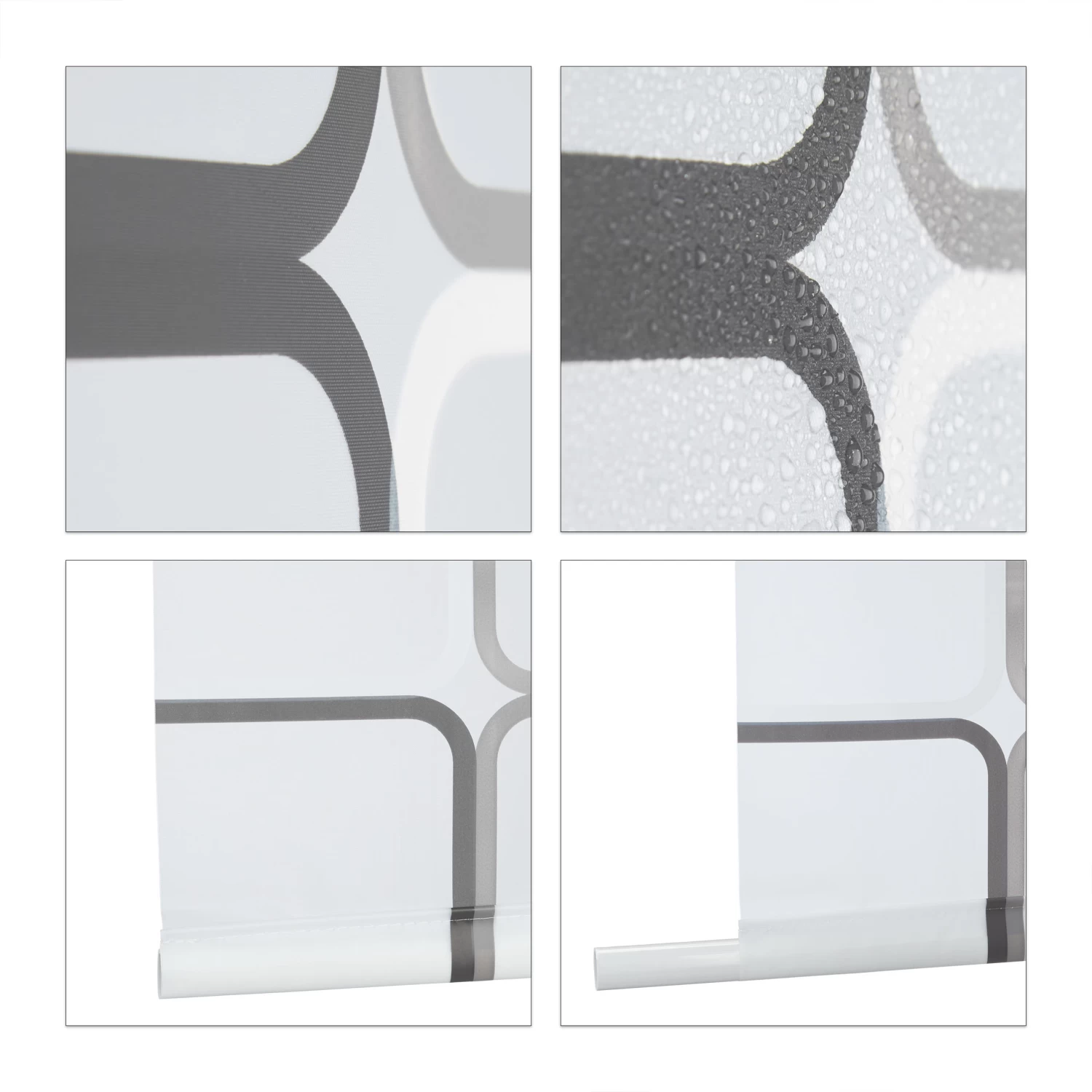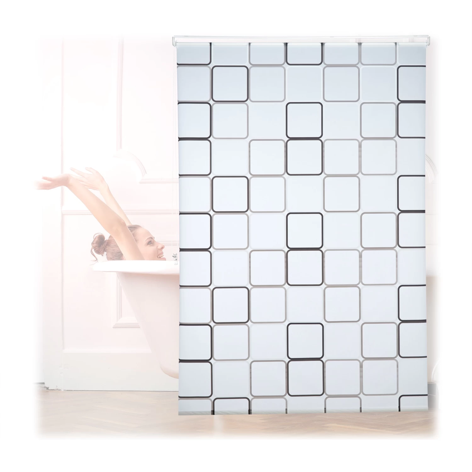Das semitransparente Badrollo mit dezenten Retro Quadern in Weiß- und Grautönen kann leicht an der Zimmerdecke angebracht werden und ist eine moderne Alternative zum herkömmlichen Duschvorhang. Durch die Beschwerung am unteren Ende liegt das Duschrollo gerade an der Badewanne an, sodass Ihre Fliesen vor Wassertropfen geschützt werden und kein lästig herumwedelnder Vorhang Sie beim Duschen stört. Bei Nichtgebrauch ziehen Sie das trockene Rollo einfach am Seilzug nach oben, sodass es dezent zusammengerollt wird.