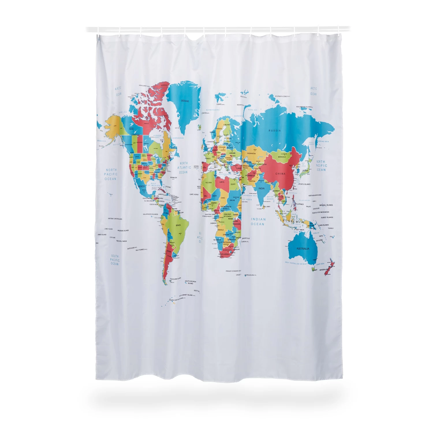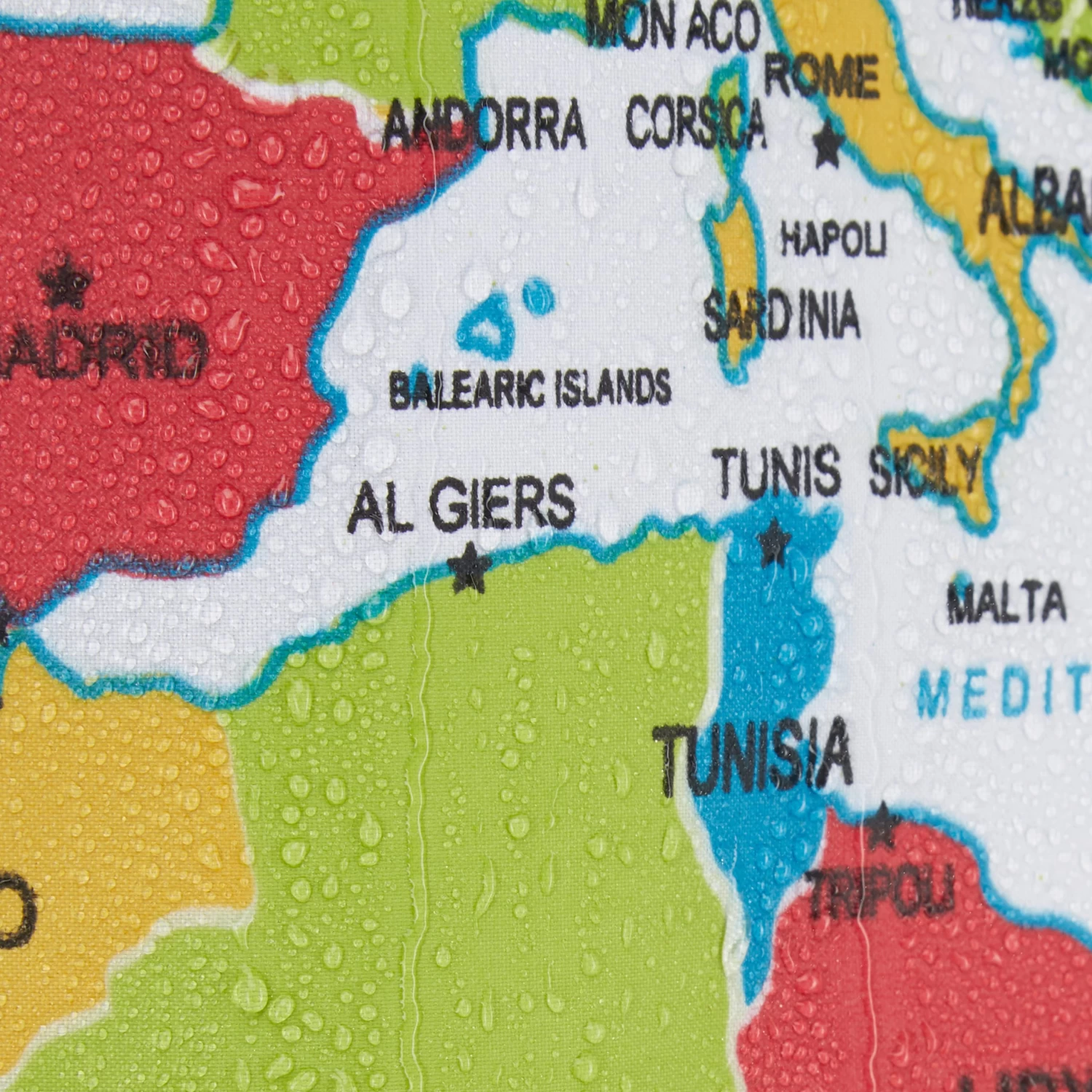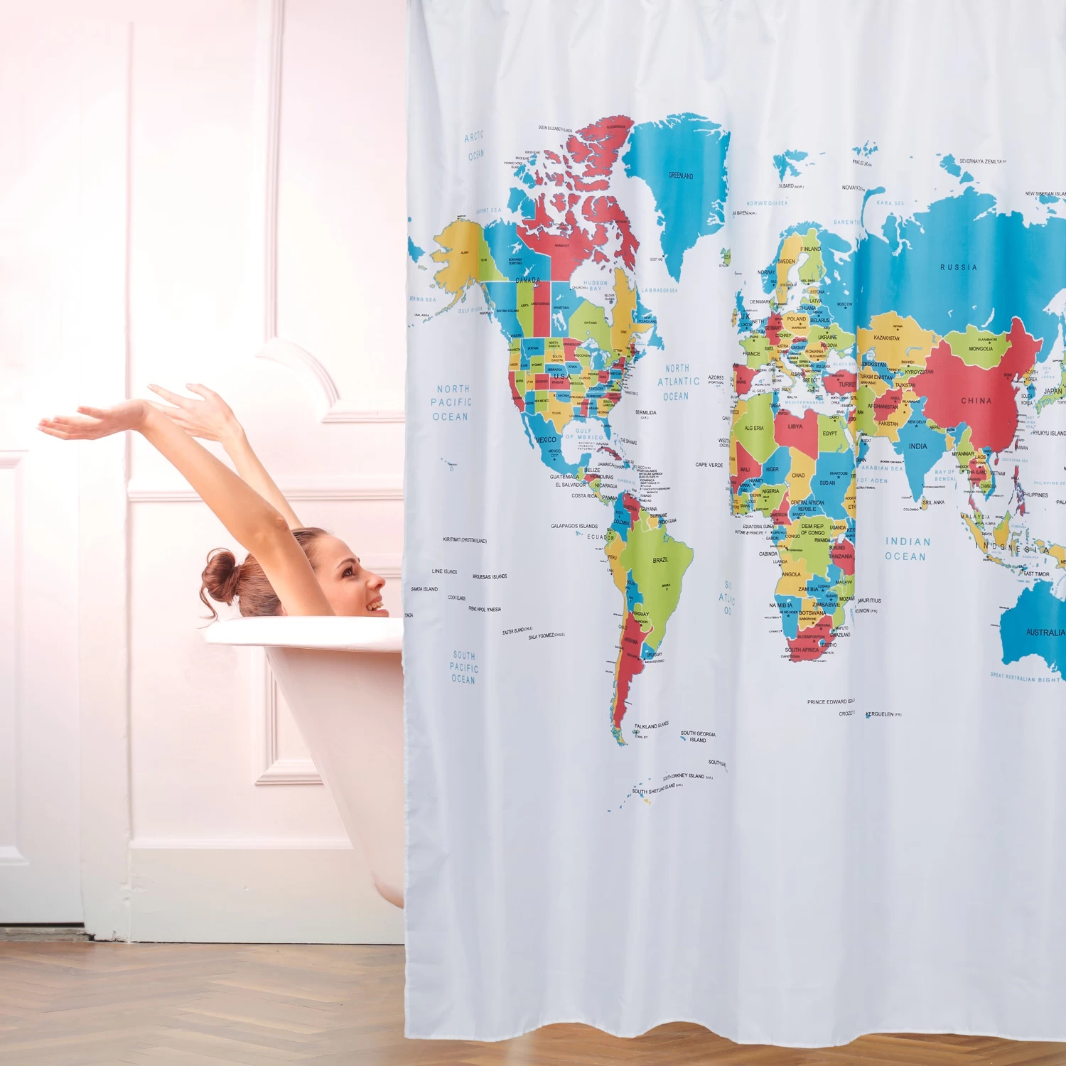 Der Duschvorhang mit bunter Weltkarte ist genau das Richtige für Reisebegeisterte. Die Länder sind in rot, blau, gelb und grün gehalten, die Meere in weiß. Mit der Karte kann man nicht nur das nächste Urlaubsziel aussuchen oder in Erinnerungen an vergangene Reisen schwelgen, sondern auch seine Englischkenntnisse auffrischen.