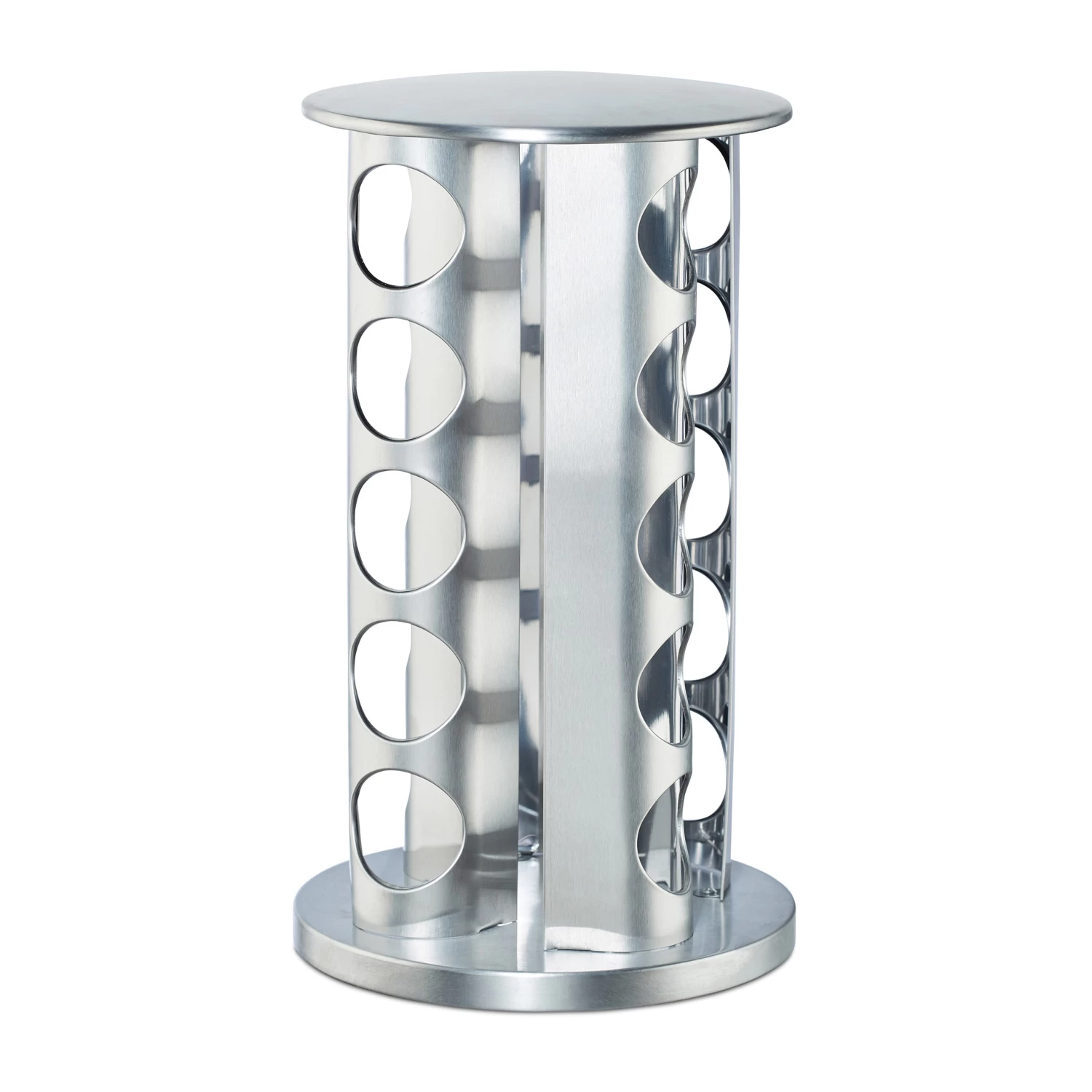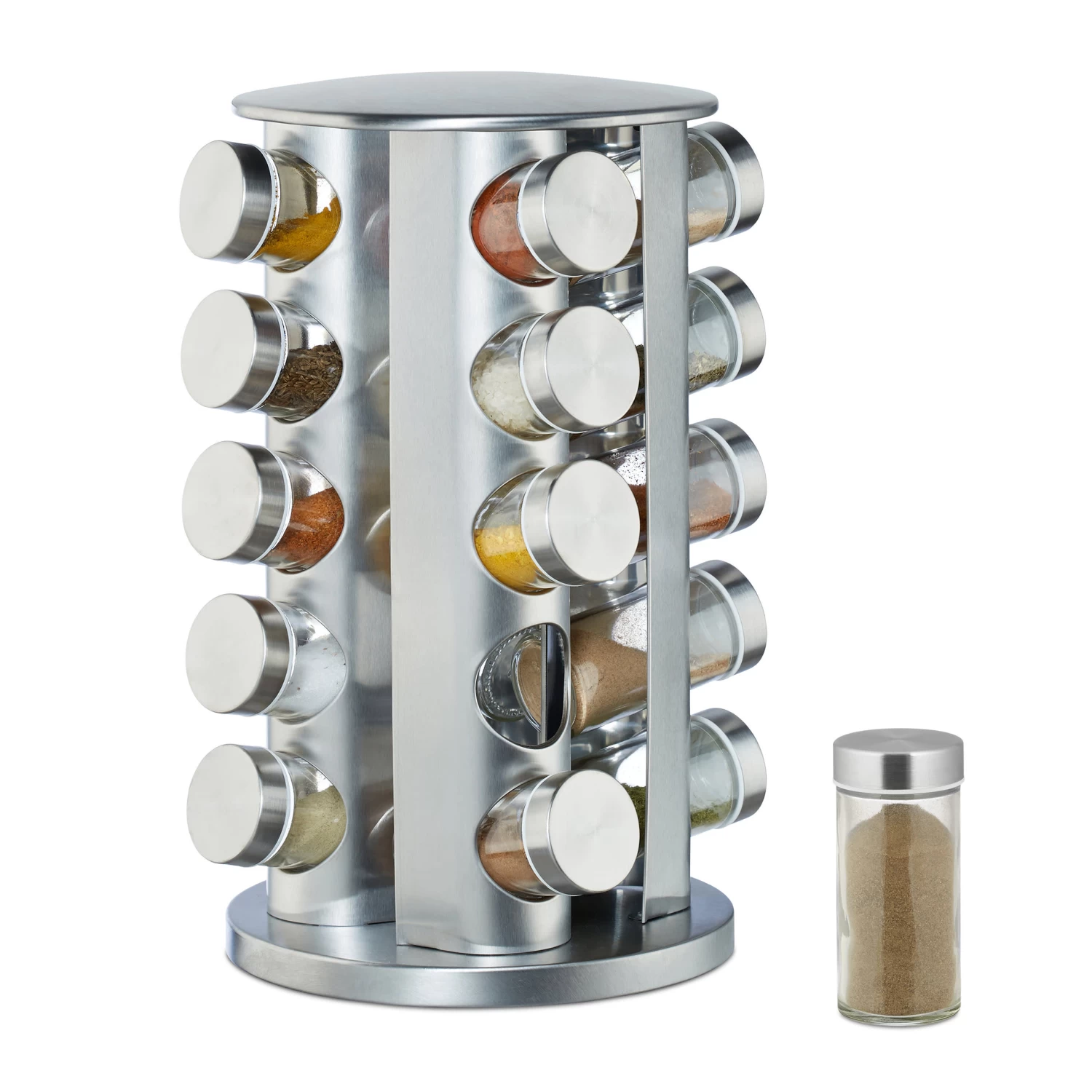 Schluss mit dem Chaos im Küchenschrank! Das moderne Gewürzkarussell aus Edelstahl bringt Ordnung auf Ihre Küchenzeile. 20 Gewürzbehälter verwahren Ihre Gewürzsammlung von C wie Curry bis S wie Salz. Unter dem Gewürzständer ist eine Kunststoff-Scheibe montiert, die das Drehen ermöglicht – so gelangen Sie stressfrei an jede Gewürzdose. Die Gewürzgläser sind auf 5 Ebenen verteilt und können dank ihrer Streueinsätze direkt als Gewürzstreuer verwendet werden.