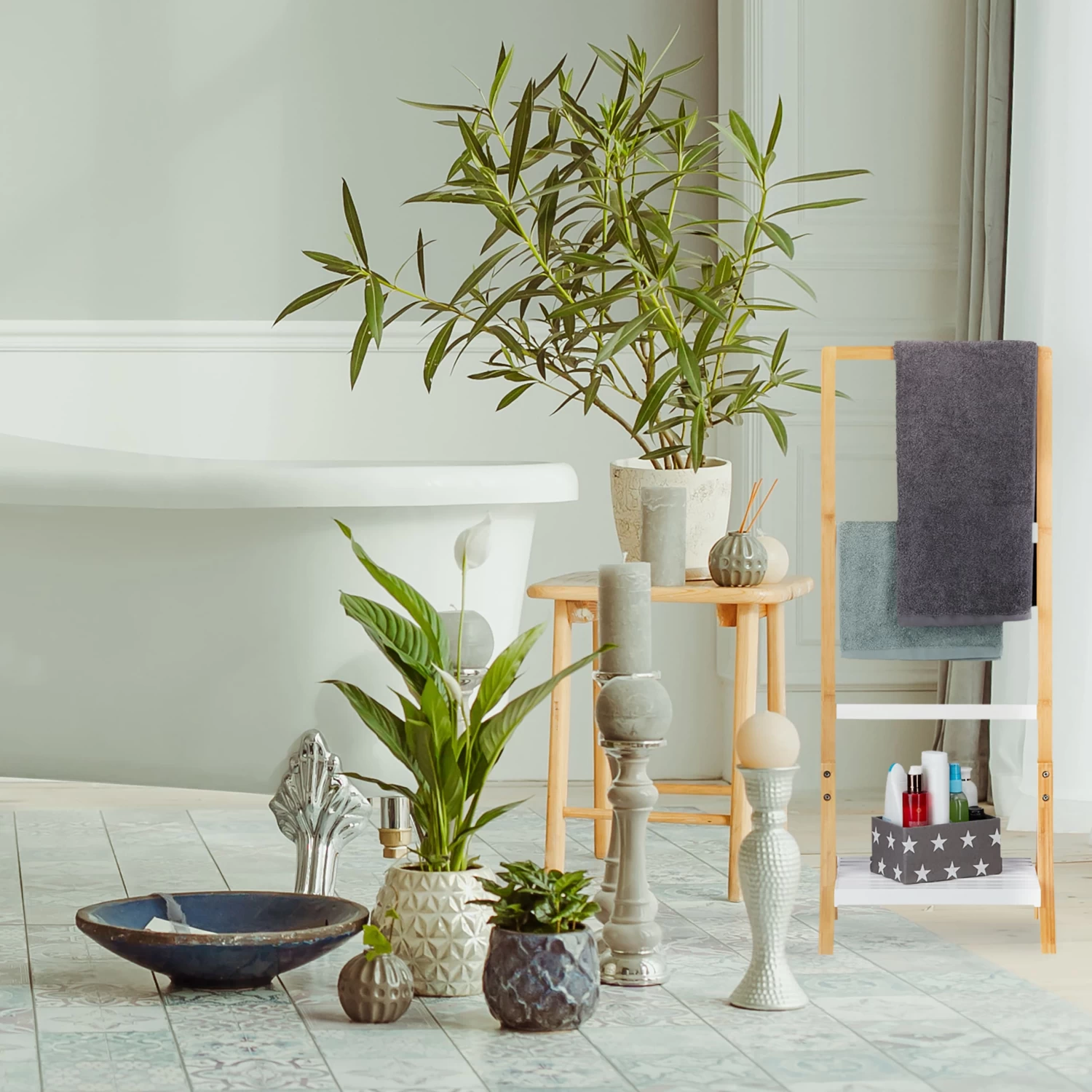 Der freistehende Handtuchständer bietet auf den 3 Handtuchstangen Aufhängmöglichkeiten für kleine und große Handtücher, sodass Sie sie griffbereit neben der Badewanne oder dem Waschbecken lagern können. Auf der weißen Ablage können Sie praktischweise Badutensilien wie Shampoo und andere Kosmetikartikel abstellen. Der moderne Materialmix überzeugt durch seine Natürlichkeit – im warmen Naturton verwandelt der Handtuchhalter Ihr Badezimmer in Ihre persönliche Spa-Oase.