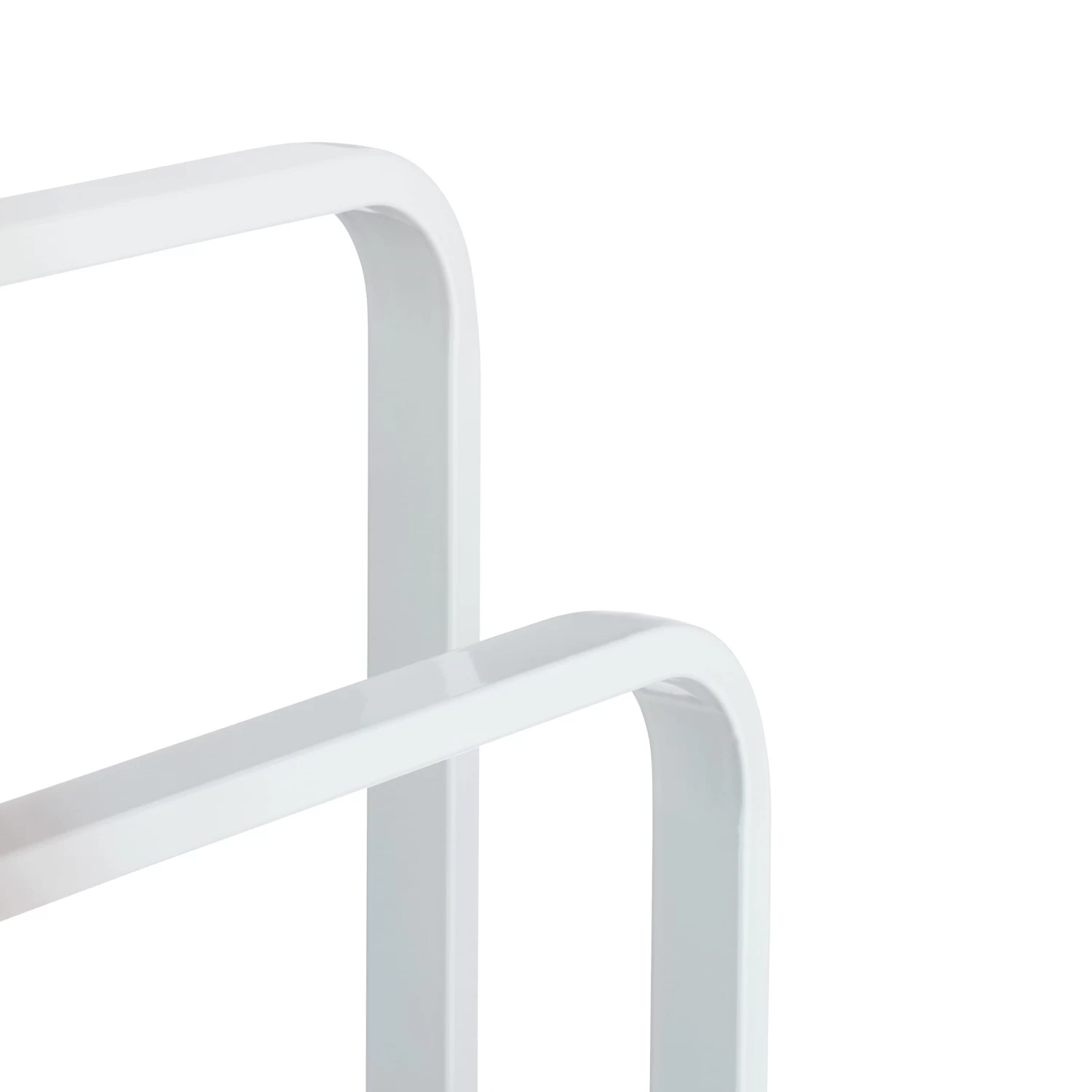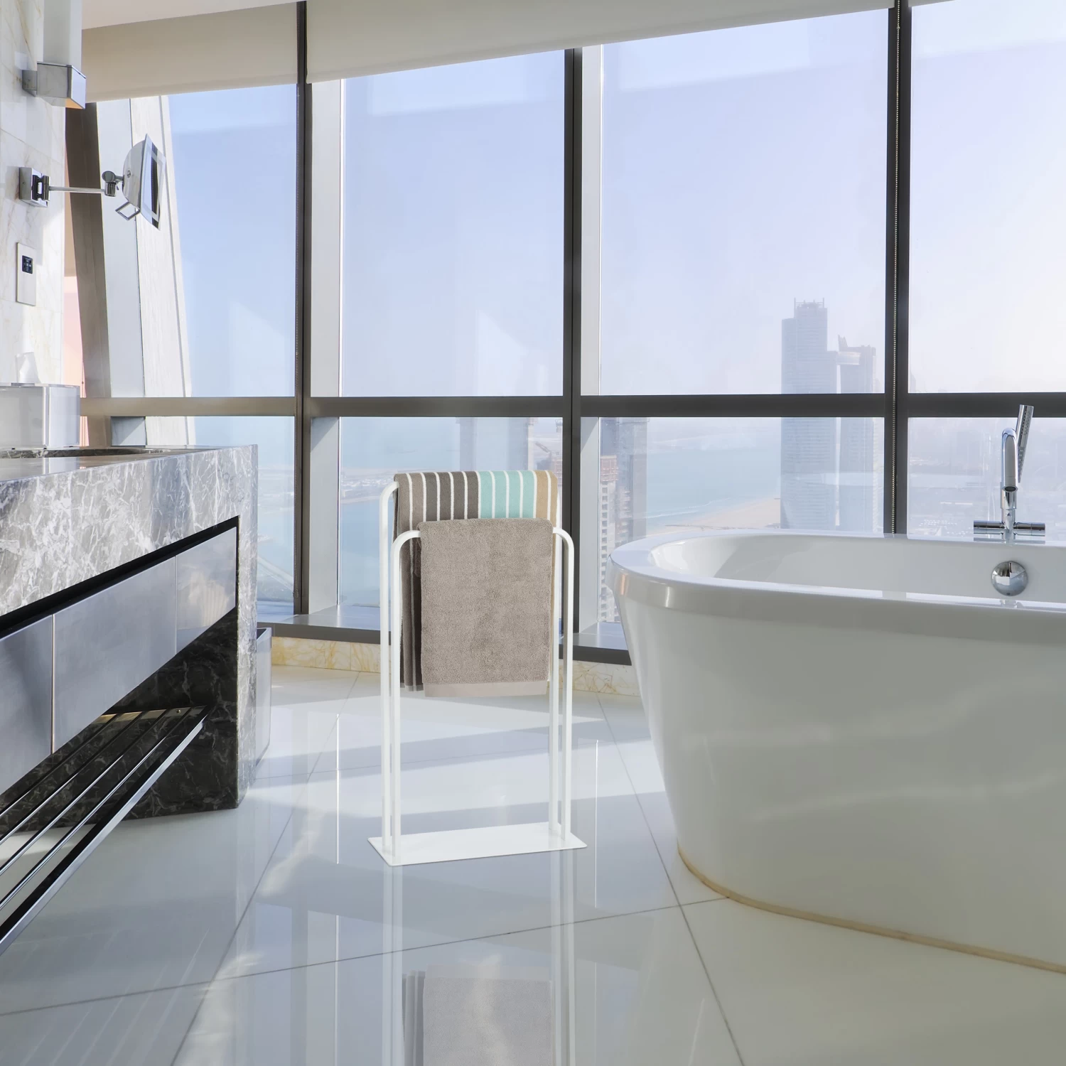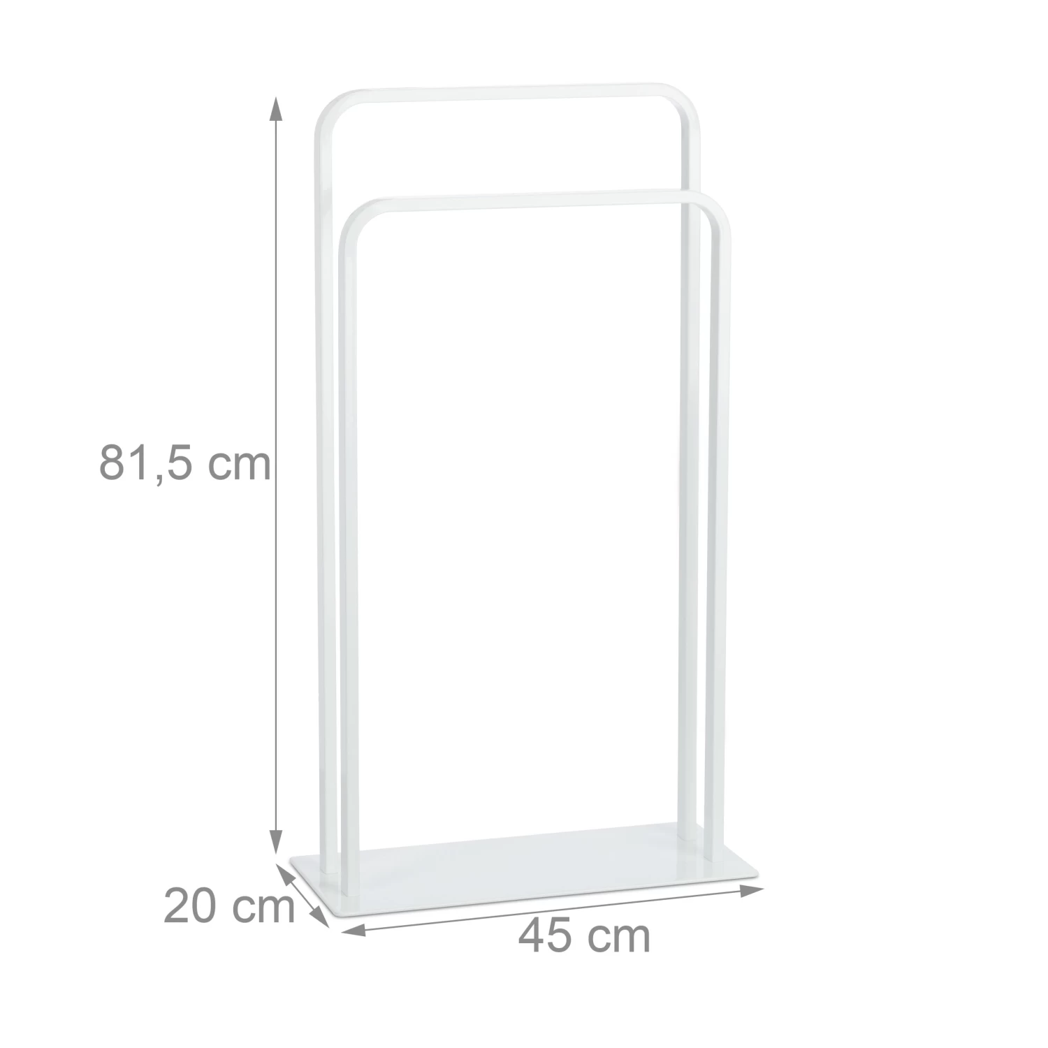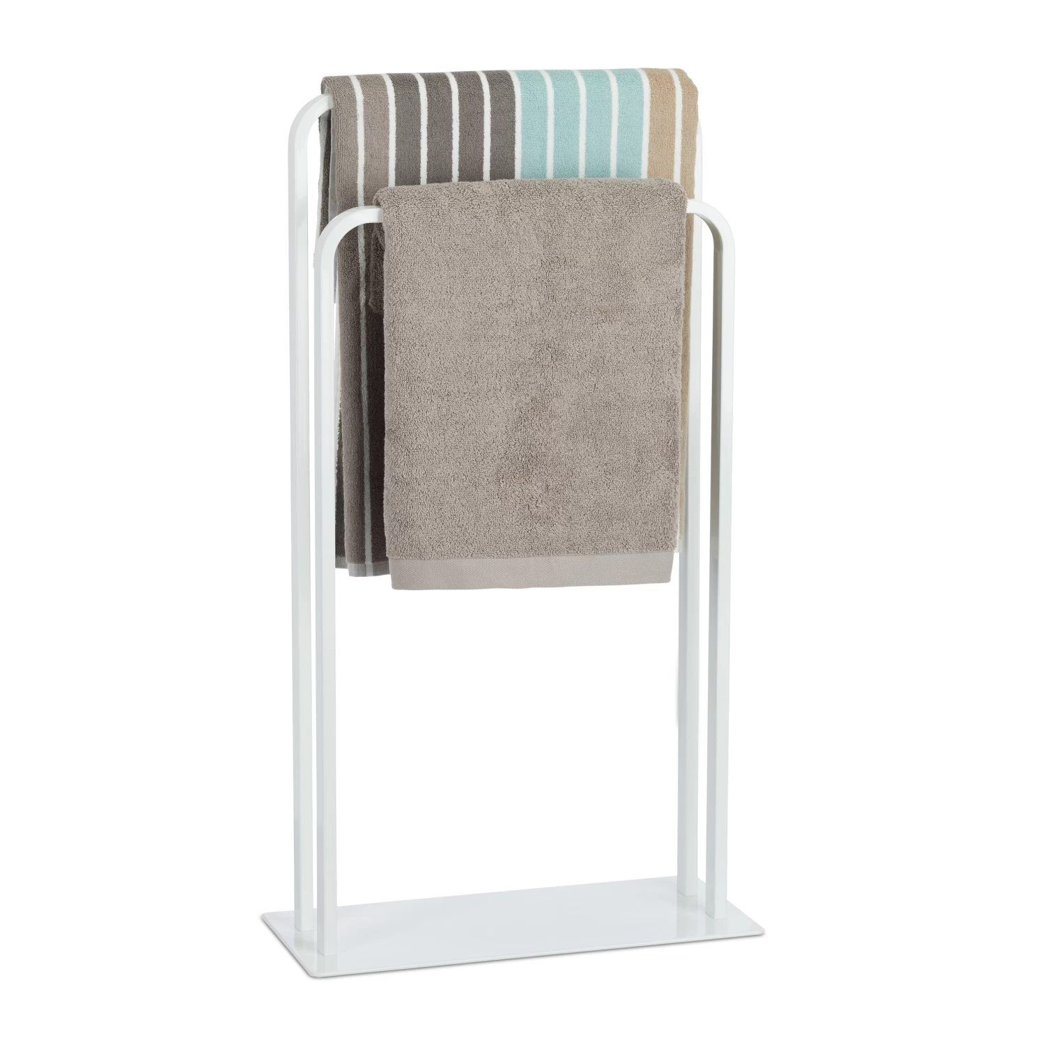 Der freistehende Handtuchhalter überzeugt mit seiner angesagten U-Form, wodurch er zu einem Hingucker in jedem Badezimmer wird. Handtücher, Waschlappen uvm. können auf dem schmalen Doppelhandtuchhalter platzsparend getrocknet werden. Dadurch eignet er sich auch als ideales Zubehör für kleine Bäder und Gäste-WCs. Der Badständer verfügt über einen beschwerten Standfuß, der stets für einen sicheren und stabilen Stand sorgt. Gumminoppen auf der Unterseite schützen den Boden vor Kratzern.