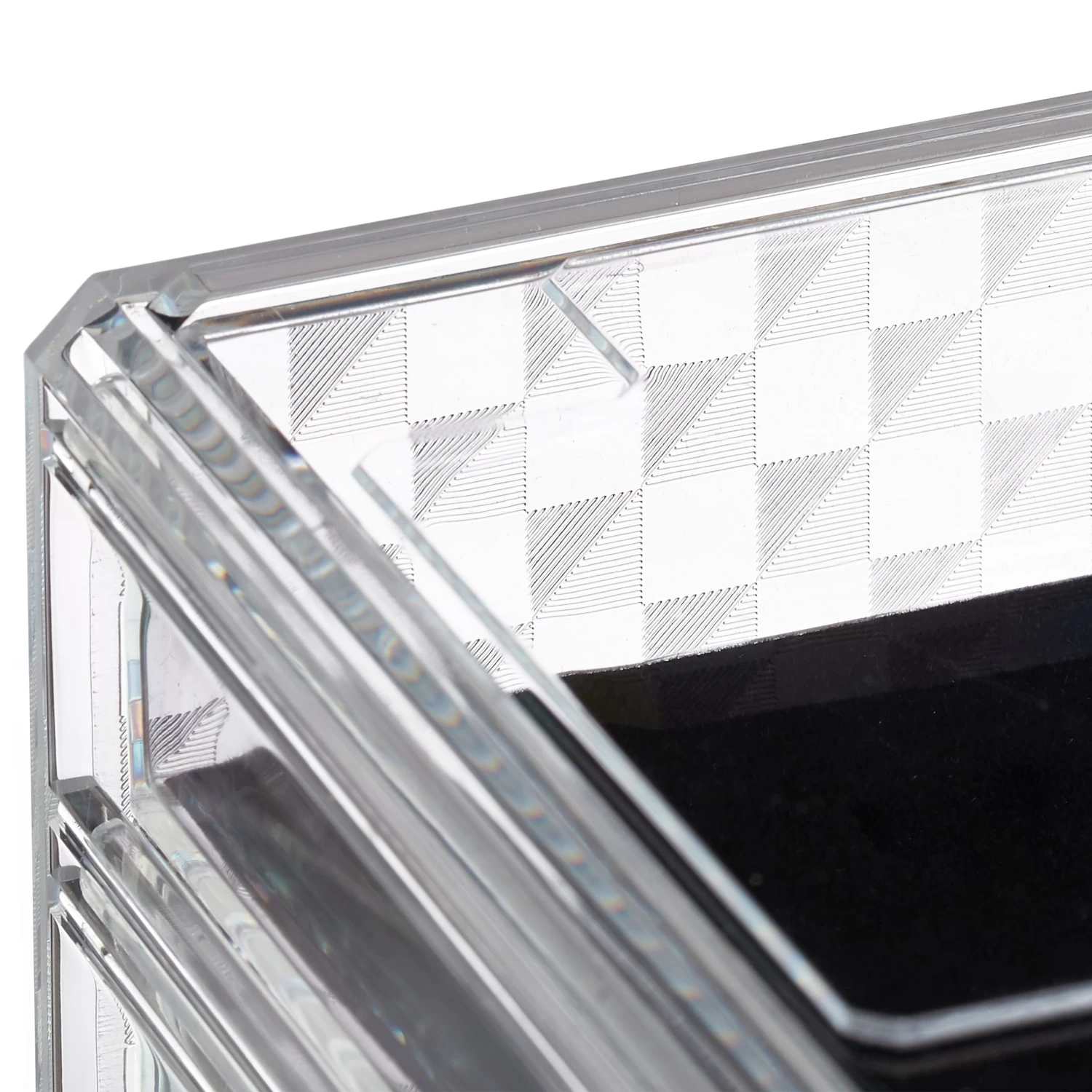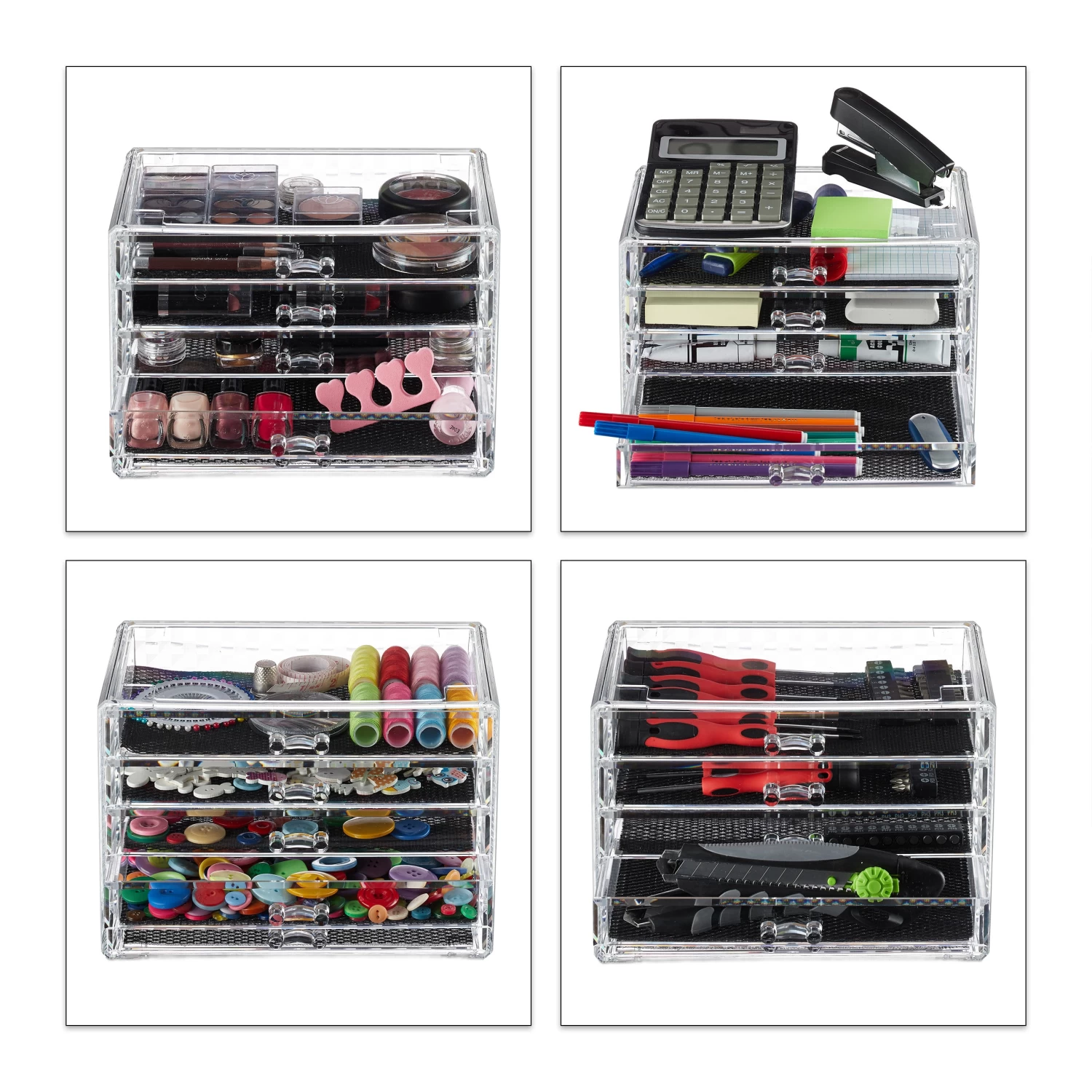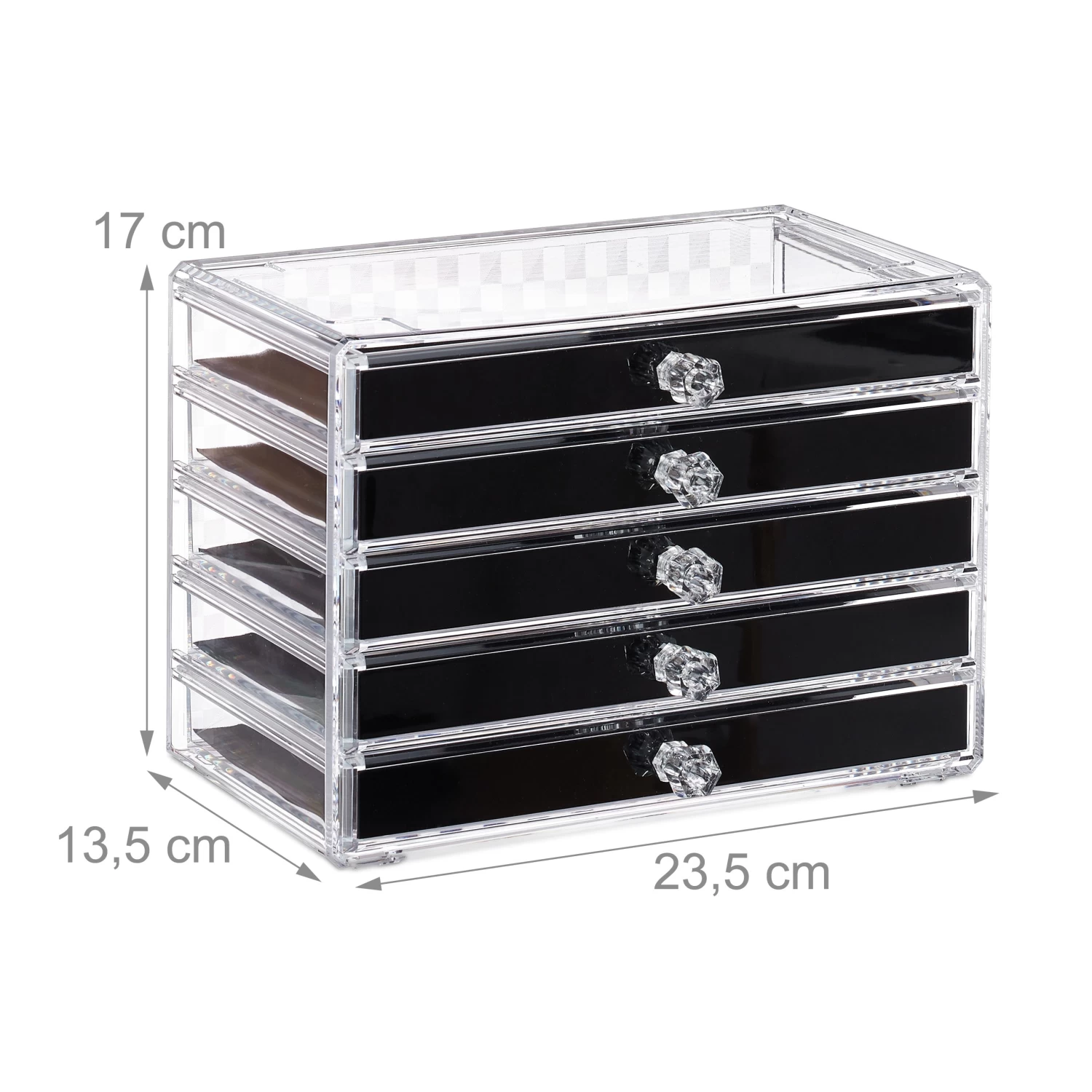 Dieser vielfältig einsetzbare Acryl Organizer hilft Ihnen, Ordnung ins Schminkchaos zu bringen. Mit seinen 5 Schubladen bietet der Make-Up Organisator ausreichend Stauraum für Nagellack, Lippenstifte, Cremes und Puderdosen. Aber auch als Schmuckkasten für Ringe und Armbänder ist die Schubladenbox ideal. Die losen Stoffeinleger schützen sowohl Organizer als auch Accessoires vor Kratzern und sorgen gleichzeitig dafür, dass Ihre Utensilien nicht verrutschen. Darüber hinaus ist die Acryl-Box auch prima zur Aufbewahrung von Büroutensilien auf dem Schreibtisch, für Nähzubehör oder für Schrauben und Nägel in der Werkstatt geeignet.