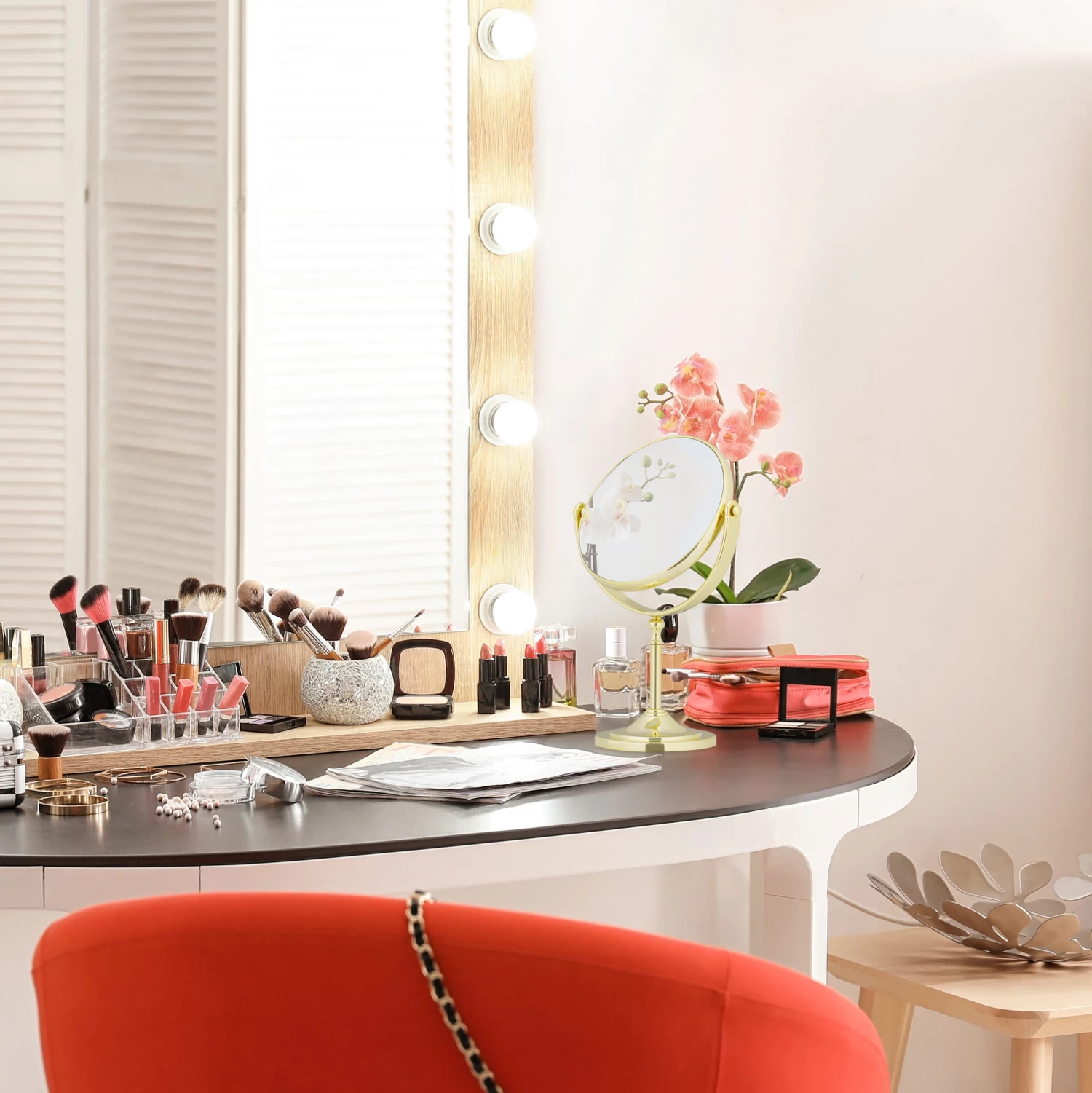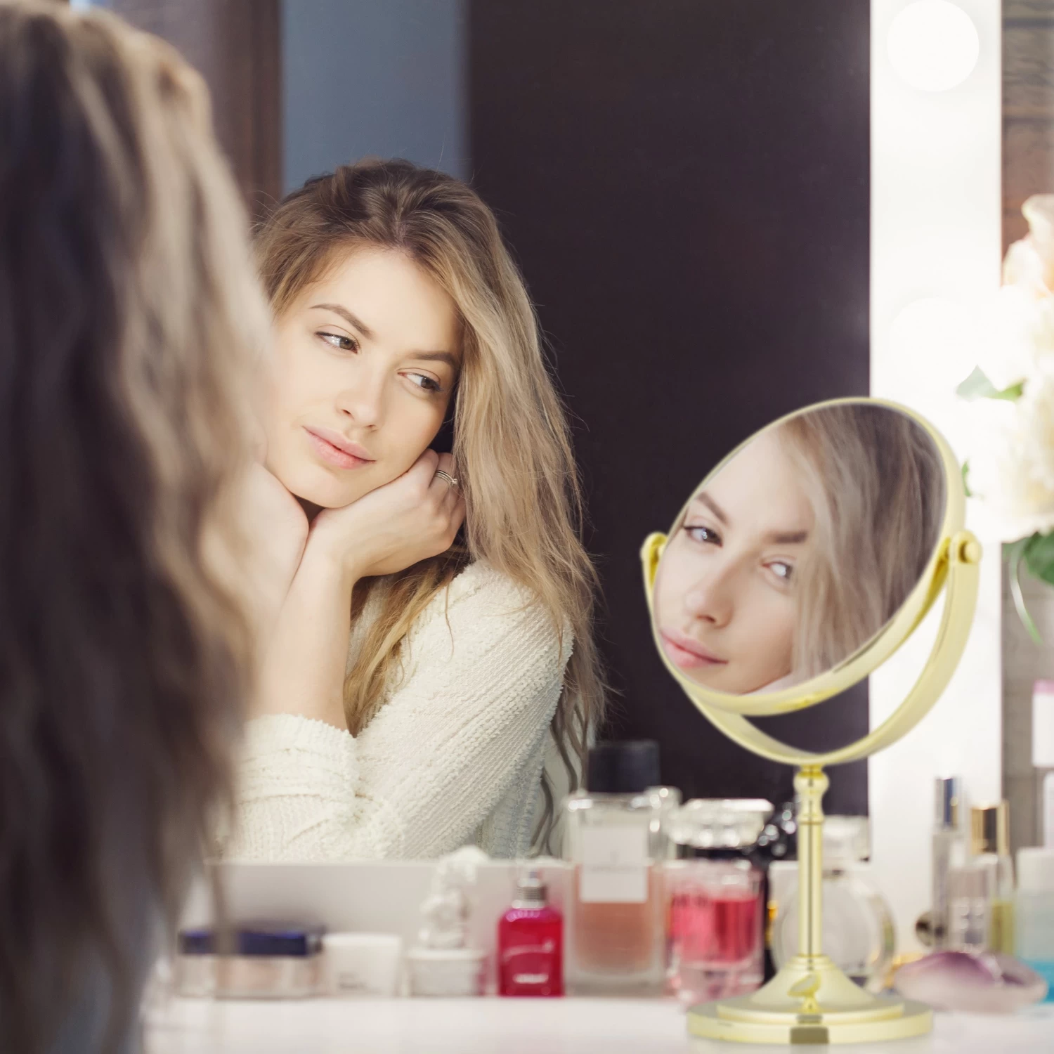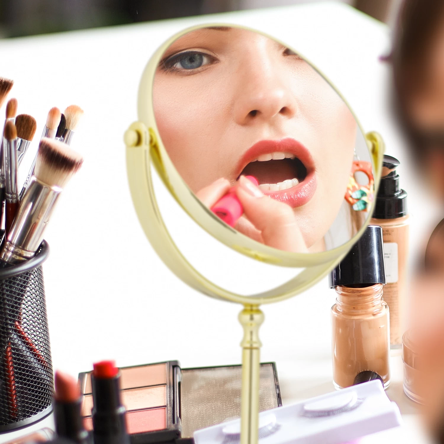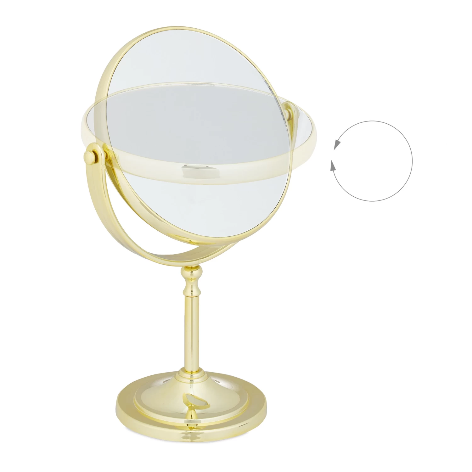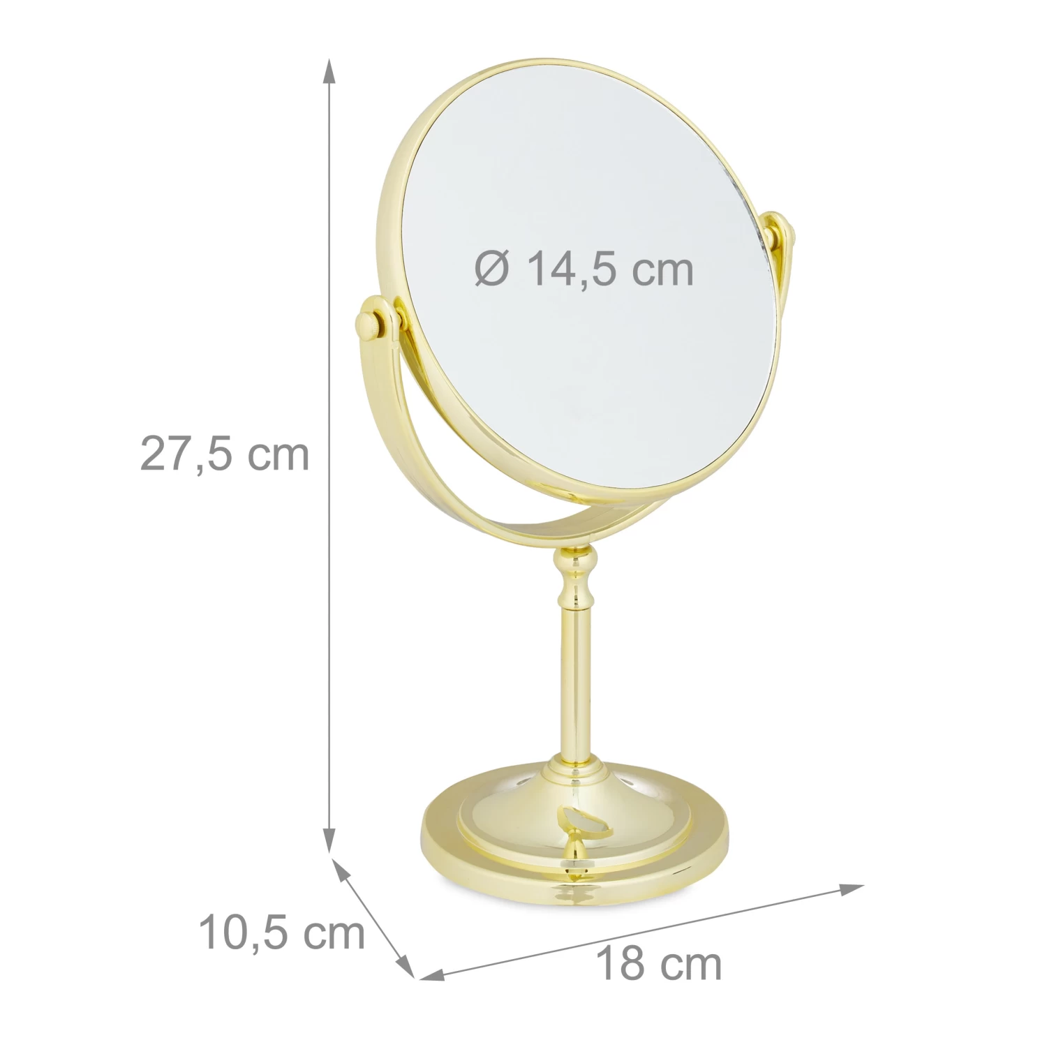 Der runde Kosmetikspiegel hilft Dir bei der täglichen Gesichtspflege wie dem Schminken oder Rasieren. Der Standspiegel ist um 360 Grad schwenkbar, wodurch der richtige Winkel perfekt eingestellt werden kann. Eine Seite des Gesichtsspiegels besitzt eine 2-fach Vergrößerung, während die andere Spiegelfläche eine einfache Ansicht abbildet. Durch den praktischen Standfuß kannst Du den Make Up Spiegel überall hinstellen. Mit seinem edlen Design passt er perfekt in jedes Bad oder auf den Schminktisch.