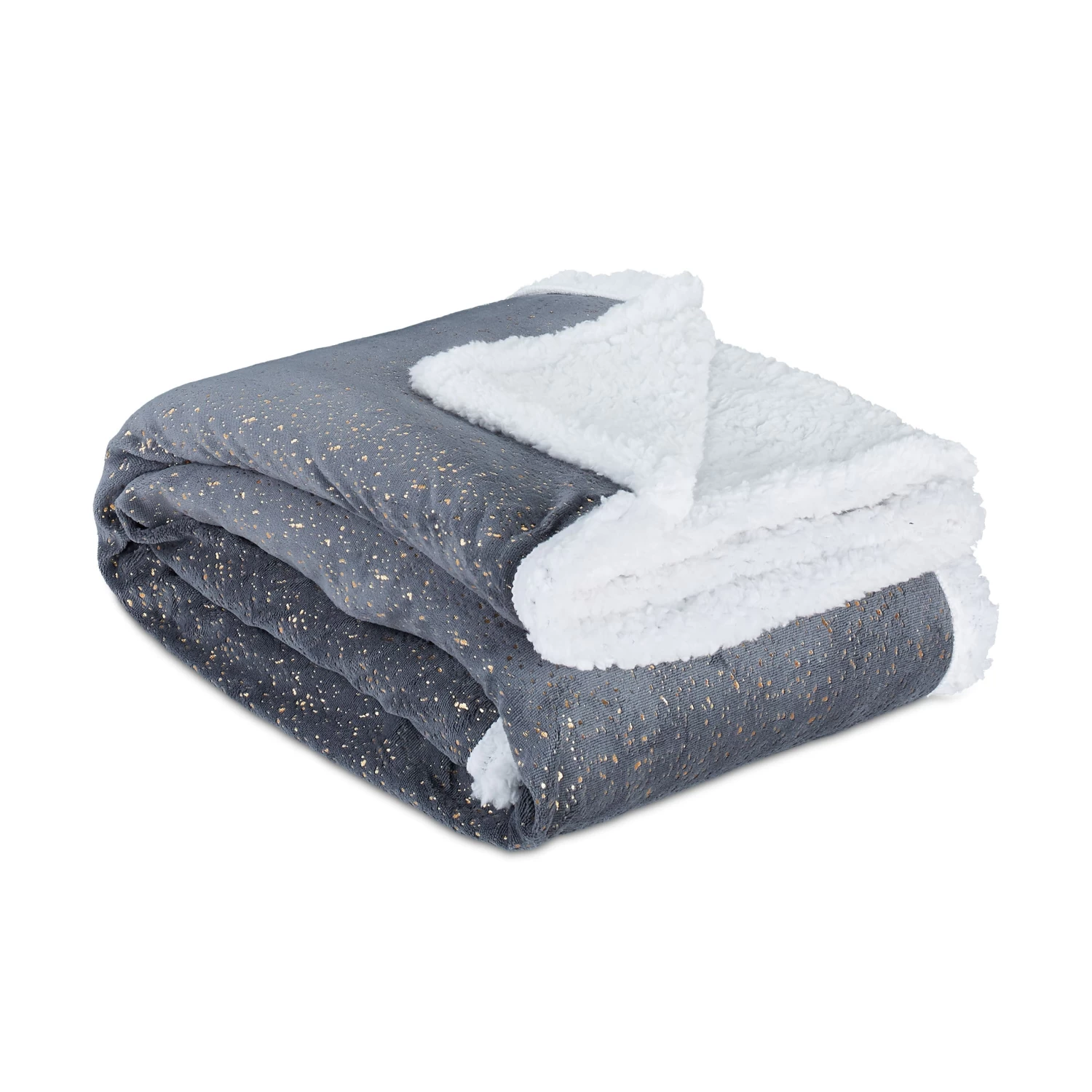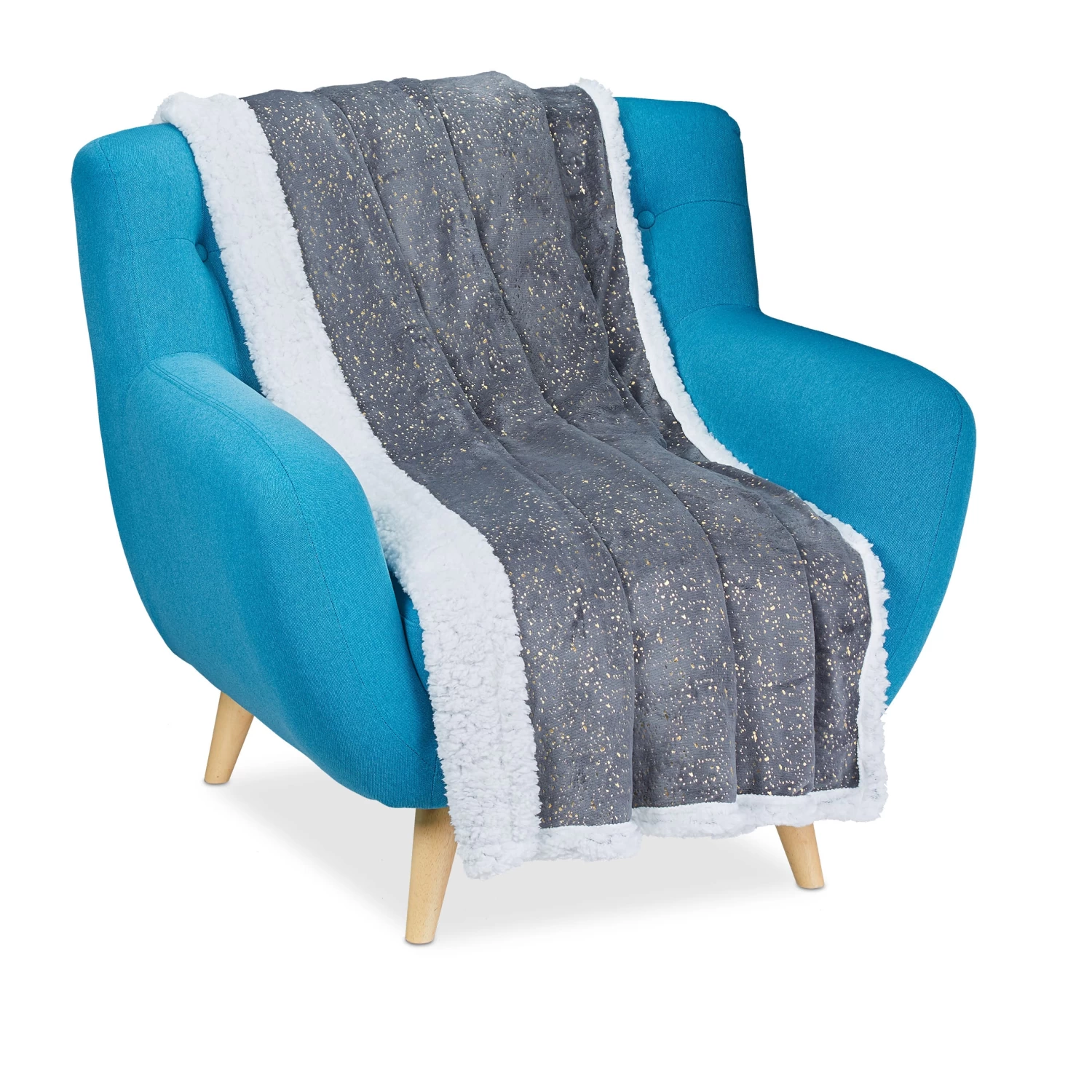 Was gibt es in der kalten Jahreszeit Besseres, als sich nach einem langen Arbeitstag mit einer Tasse Tee oder einer heißen Schokolade auf der Couch einzukuscheln? Die flauschige Wohndecke in Grau mit dekorativen goldenen Prints ist da genau das richtige Accessoire. Mit ihrer Unterseite in weißer Lammfelloptik spendet sie angenehme Wärme und sorgt für behagliche Gemütlichkeit. Auch für laue Sommerabende auf der Terrasse oder gemeinsame Abende unter dem Sternenhimmel ist die Flauschdecke ideal.