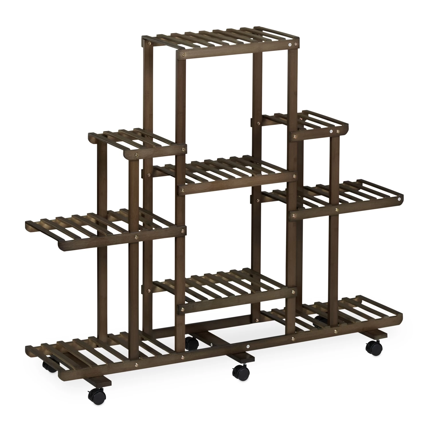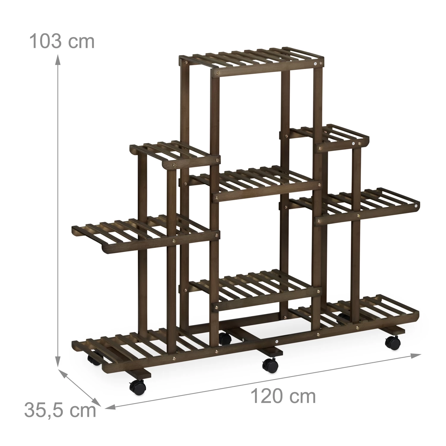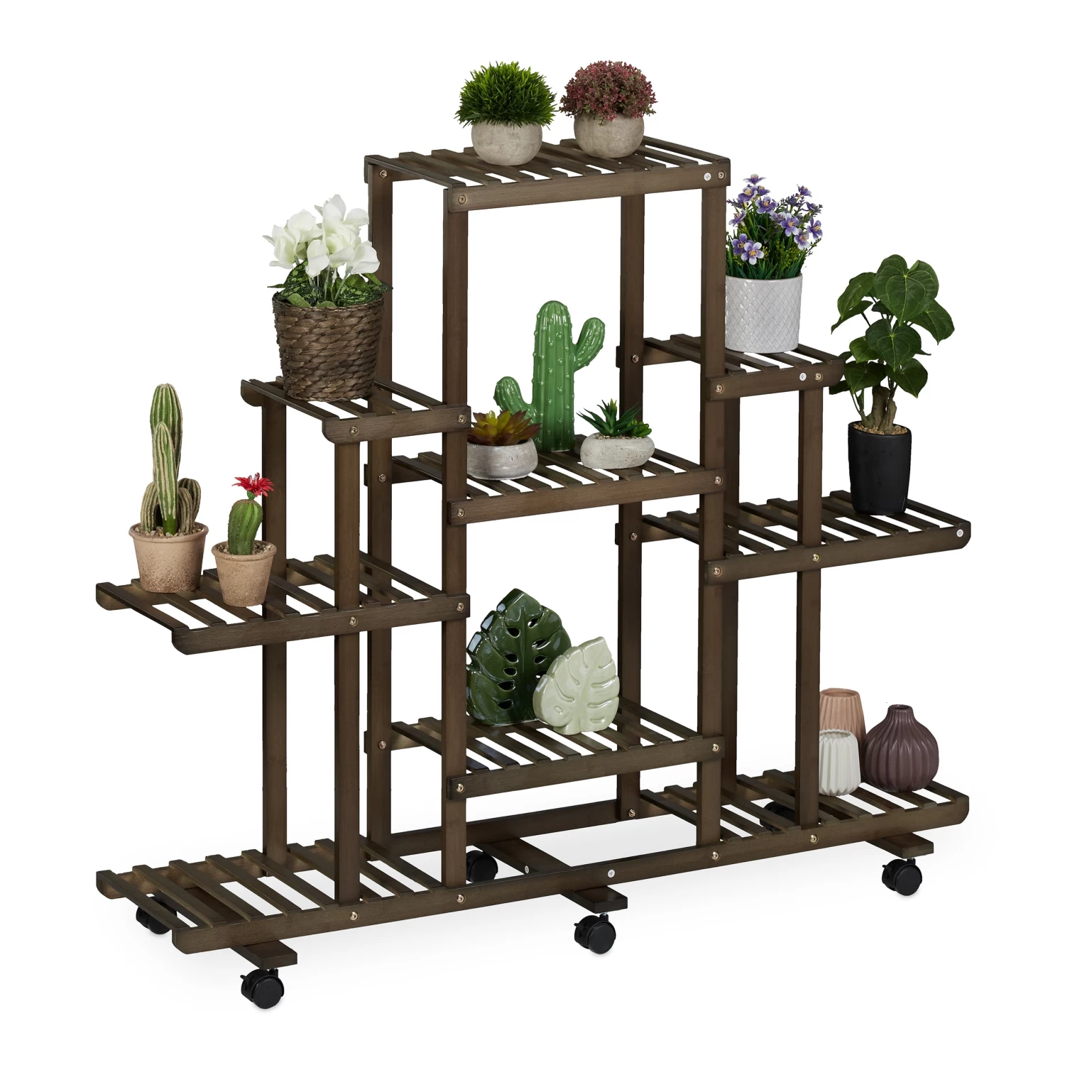 Das große Pflanzenregal schafft den nötigen Platz, um Deine geliebten Zimmerpflanzen dekorativ zu präsentieren. Ob Blumen- oder Pflanztopf, Trockenblumen oder Dekoartikel, auf den 9 geräumigen Stufen kommen Deine Arrangements bestens zur Geltung. Mit ihrem Design aus natürlichem Bambus überzeugt die braune Pflanzentreppe im Wohn- und Schlafzimmer. Bei Bedarf kann das Regal dank der 6 Rollen leicht verschoben werden.