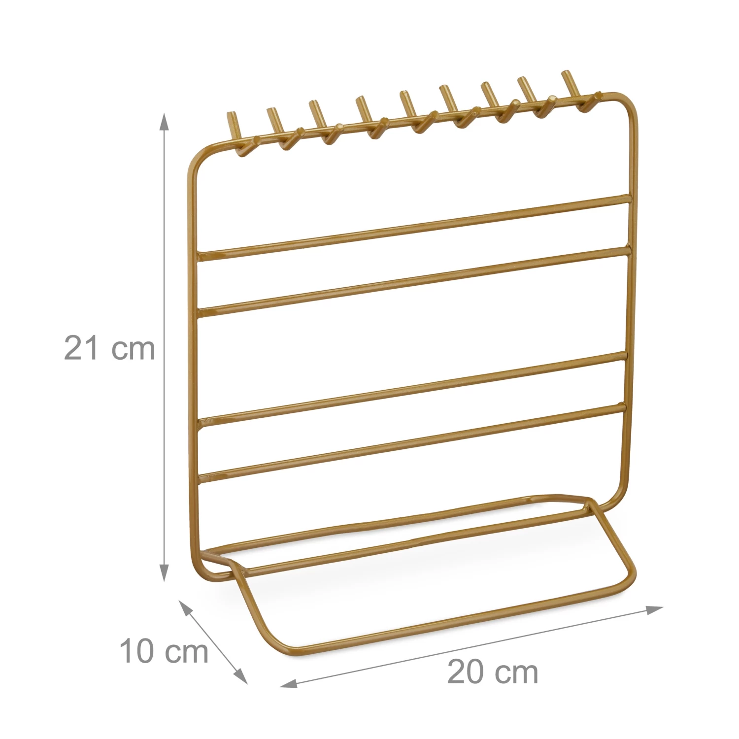 Im Bad liegt alles voller Schmuck, die Ketten sind verheddert und Sie können Ihre Lieblingsohrringe nicht finden? Dieser Schmuckständer ist die Lösung! Auf 18 Haken ist Platz für Ihre Ketten, Ringe und Armbänder und die 4 Querstangen sind ideal für die Aufbewahrung von Ohrhängern und Armbändern mit Verschluss. Doch auch Uhren oder Sonnenbrillen sind gut auf dem Schmuckhalter aufbewahrt. Durch das schlichte Design steht Ihr Schmuck im Mittelpunkt und der Kettenständer passt in jede Einrichtung.