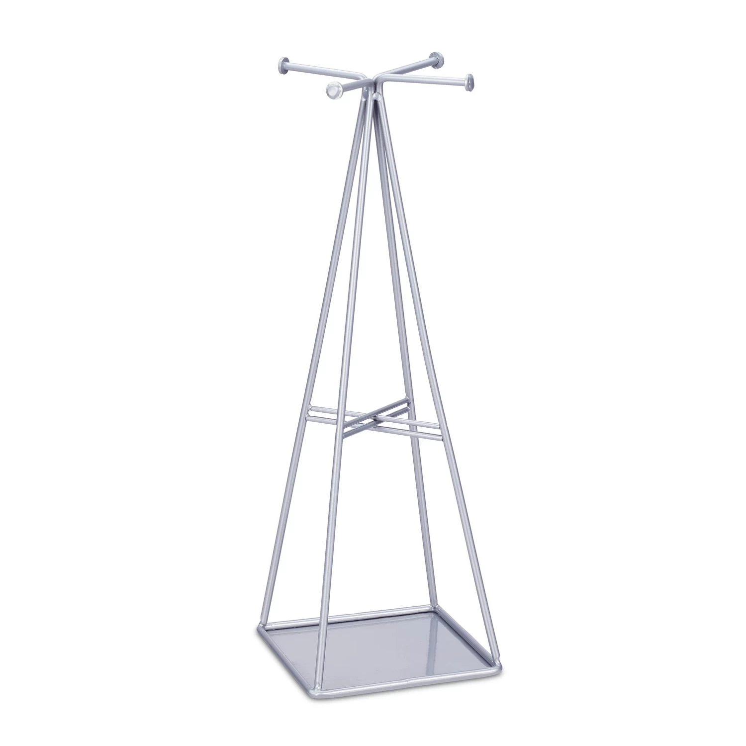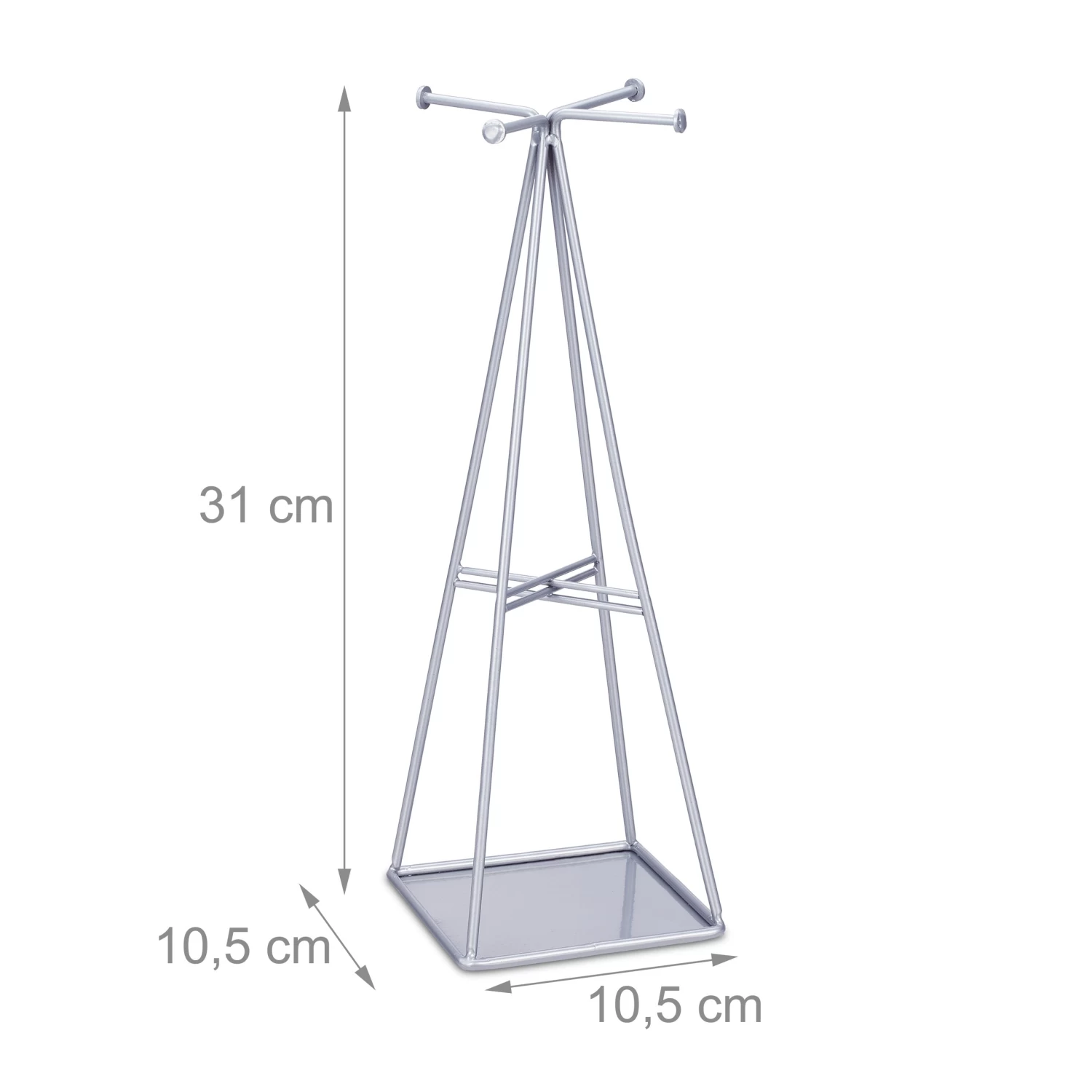 Die elegante Kettenaufbewahrung im originellen Pyramiden-Design sorgt für Ordnung und Übersicht auf dem Frisiertisch. Vier Kettenstangen bieten ausreichend Platz für kurze sowie lange Halsketten. An den Querstreben können Ohrringe und -stecker aufgehängt werden. Der Boden ist zugleich Ablage für Ringe, Broschen und andere Schmuckstücke oder Accessoires. Dank der schlichten, zeitlosen Optik fügt sich der Ketten-Organizer hervorragend auf jedem Schminktisch ein.
