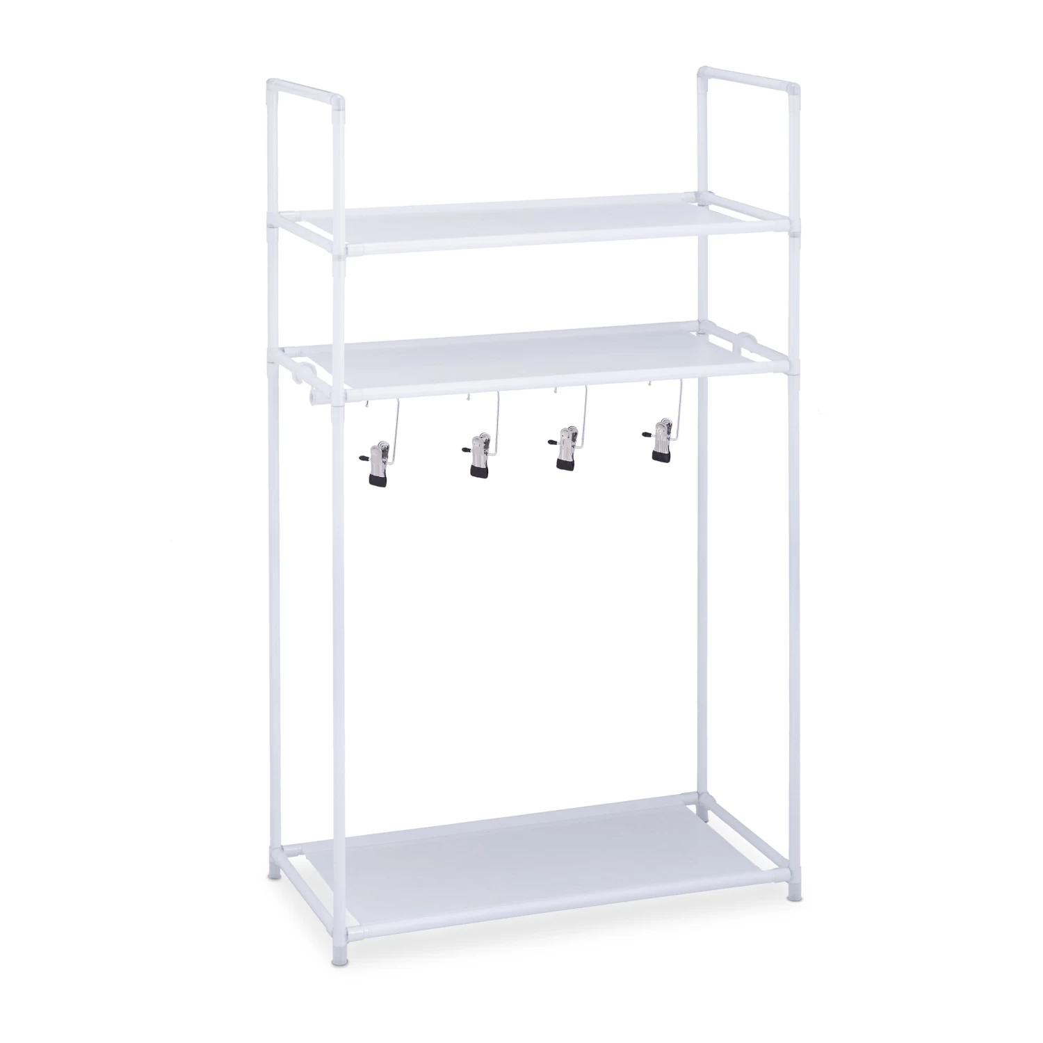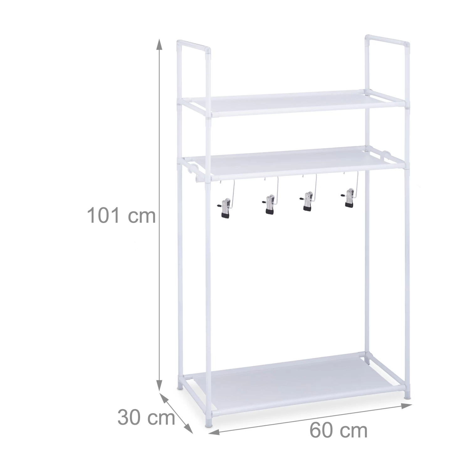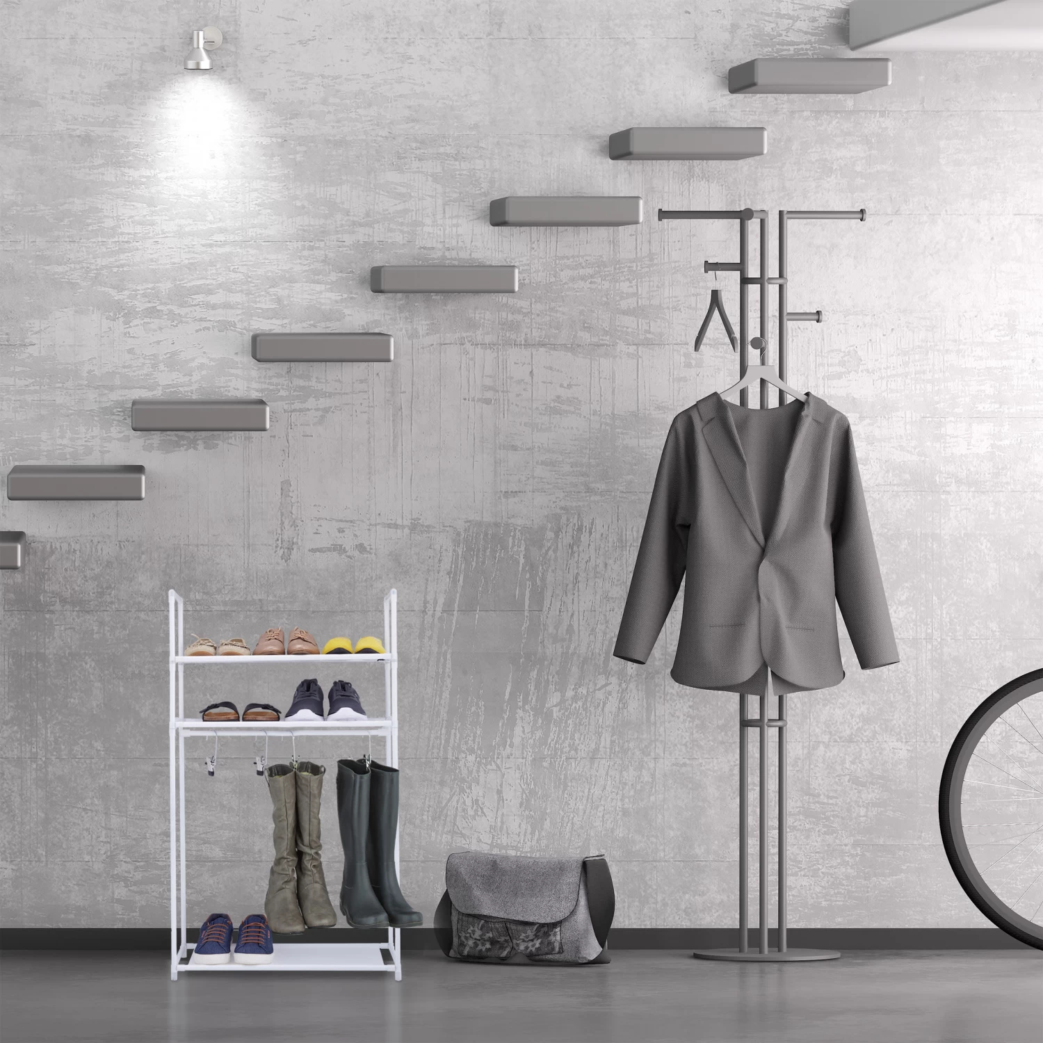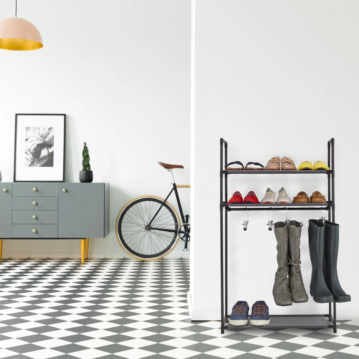 In diesem Schuhregal mit Stiefelfach lassen sich auf 3 Ebenen aus gespanntem Vlies bis zu 10 Paar Schuhe unterbringen. 4 Haken bieten Platz für Stiefel. Aufgrund des einfachen Steckprinzips lässt sich die Schuhablage schnell und einfach aufbauen. Das robuste Stahlgestell des Schuhorganizers sorgt dabei für entsprechende Stabilität. Mit seiner geringen Tiefe eignet sich das Sneakerregal besonders für schmale Flure und Treppenhäuser und auch beim Camping überzeugt es dank geringem Gewicht.