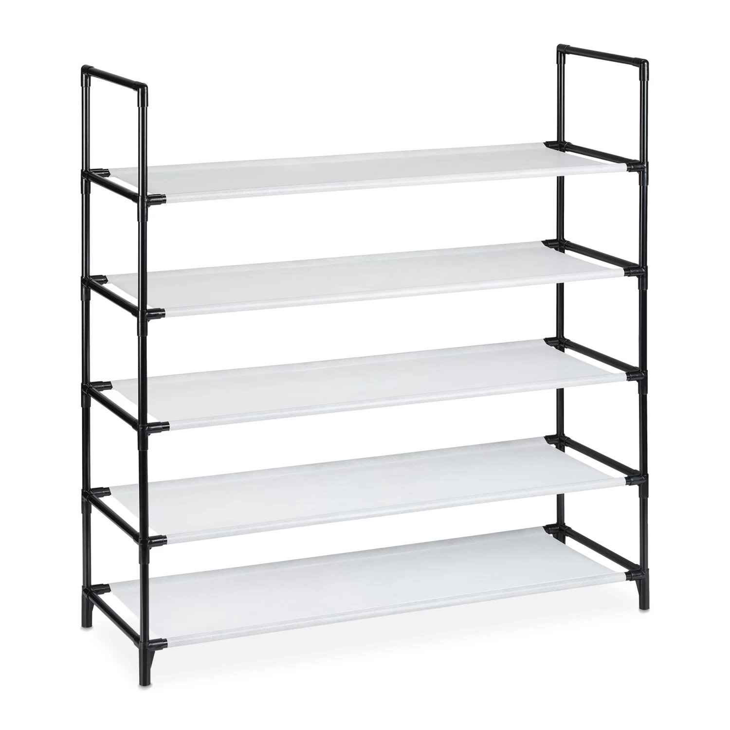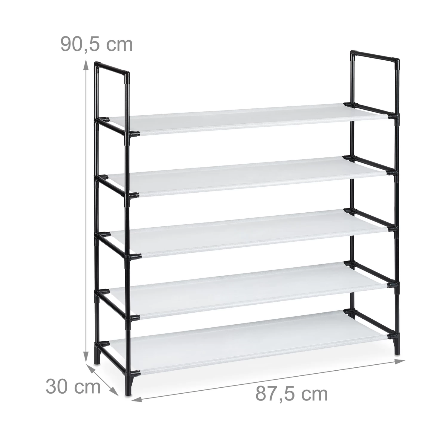 Die hohe XL Schuhablage bietet idealen Stauraum für den Flur oder das Treppenhaus. Auf den 5 breiten Ablagen aus Vlies können insgesamt – je nach Größe – bis zu 20 Paar Schuhe abgestellt werden. Das XL Stecksystem Schuhregal ist offen und minimalistisch gehalten. Dank des Metall-Gestells ist es sehr solide. Der Aufbau geht durch das simple Stecksystem leicht von der Hand. Die Konstruktion kann nach Belieben angepasst werden – je nach Ihren Wünschen lässt sich die Höhe auch reduzieren.