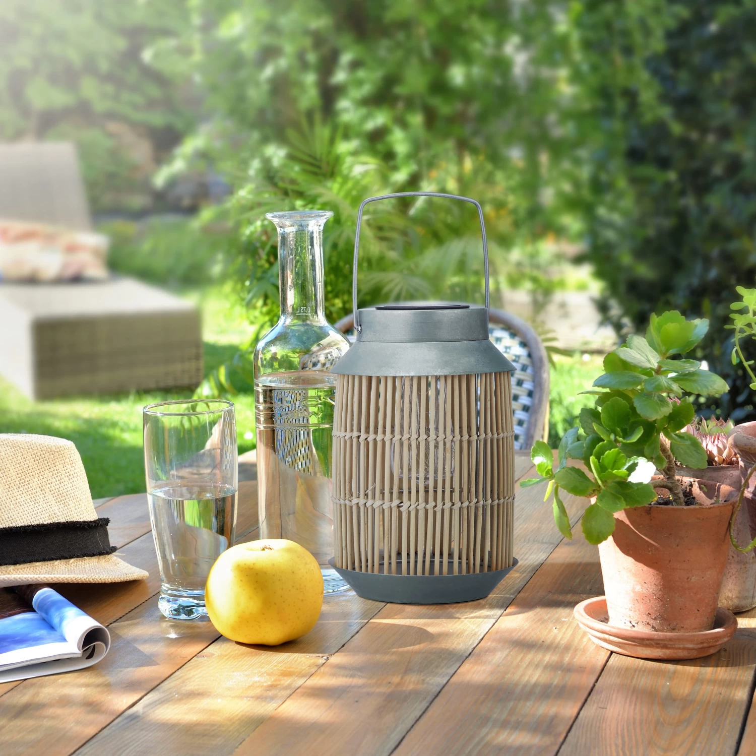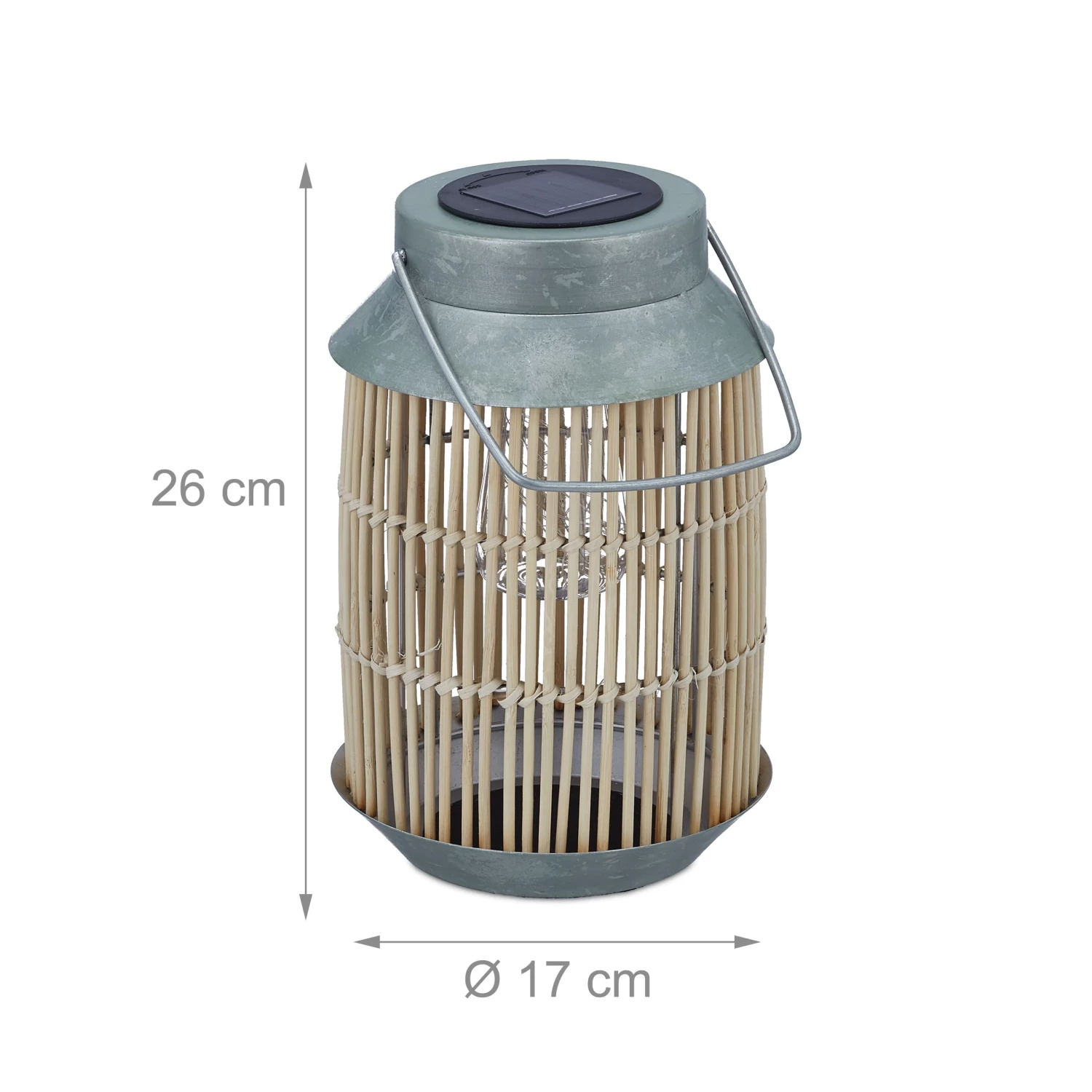 Die Solarlampe im Retro-Look sorgt für gemütliche Beleuchtung im Dunkeln auf Terrasse, Balkon oder im Garten. Tagsüber lädt sich die Outdoor Lampe auf und sobald die Dunkelheit einsetzt, lässt der Sensor die integrierte LED Lichterkette im Inneren leuchten. Zum Ein- und Ausschalten musst Du einfach den Deckel mit dem Solarpanel aufdrehen. Je nach Lust und Laune kann die Balkonleuchte auch aufgehängt werden. Der Materialmix aus Rattan und Stahl macht die Außenleuchte zu einem optischen Highlight.