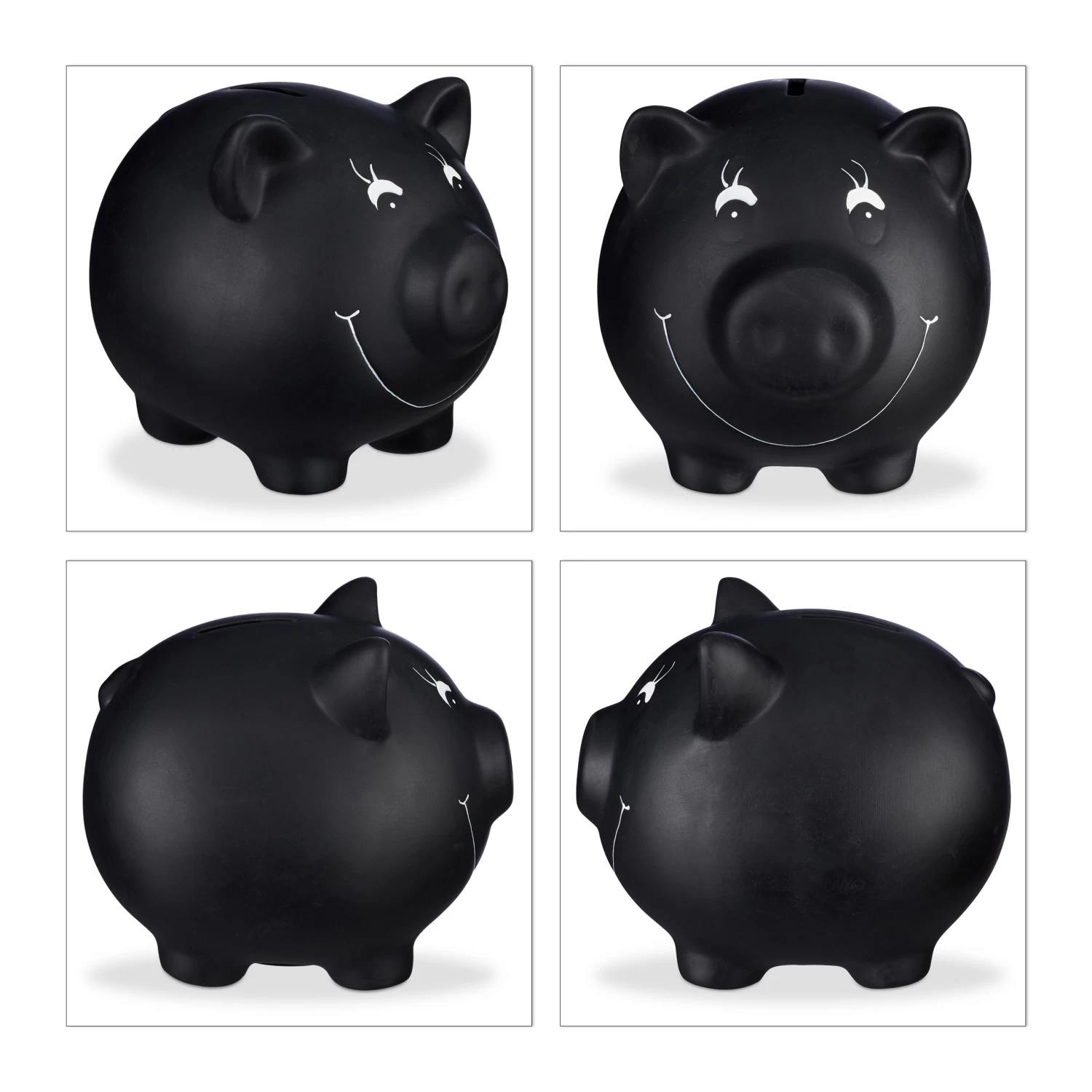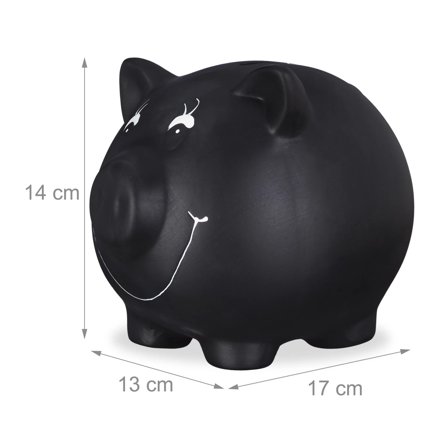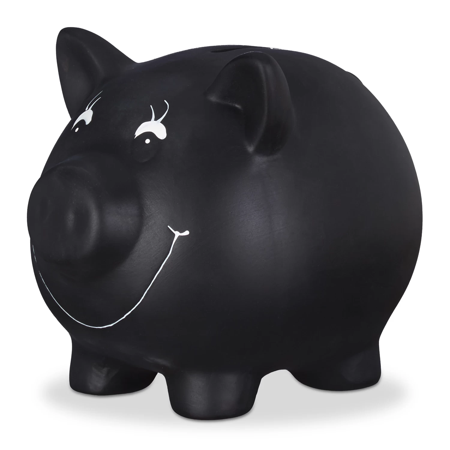 Das Glücksschwein aus Keramik ist mit Tafellack beschichtet und kann daher individuell gestaltet werden, zum Beispiel mit einem originellen Spruch, dem Alter des Geburtstagskindes oder einem lustigen Bild. Wenn das Kleingeld oder die Scheine entnommen werden sollen, muss es nicht kaputt geschlagen werden, sondern die kleine Öffnung auf der Unterseite wird einfach aufgeschlossen.