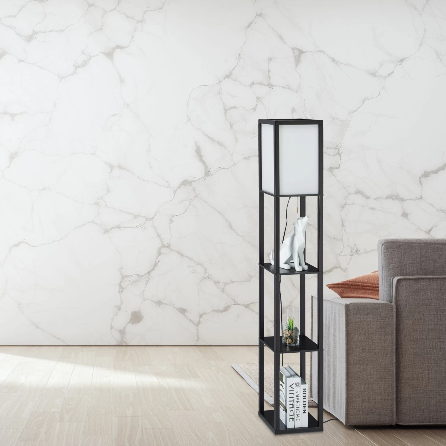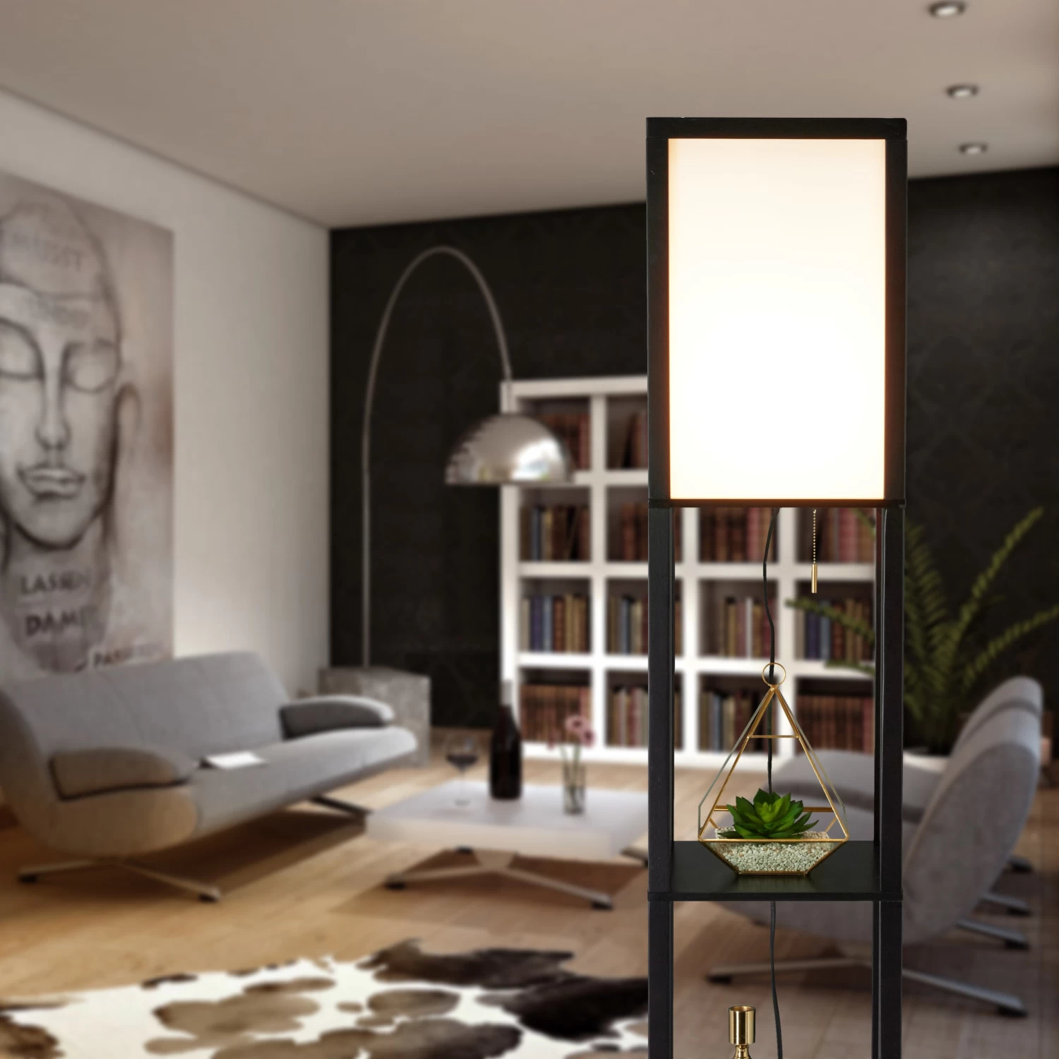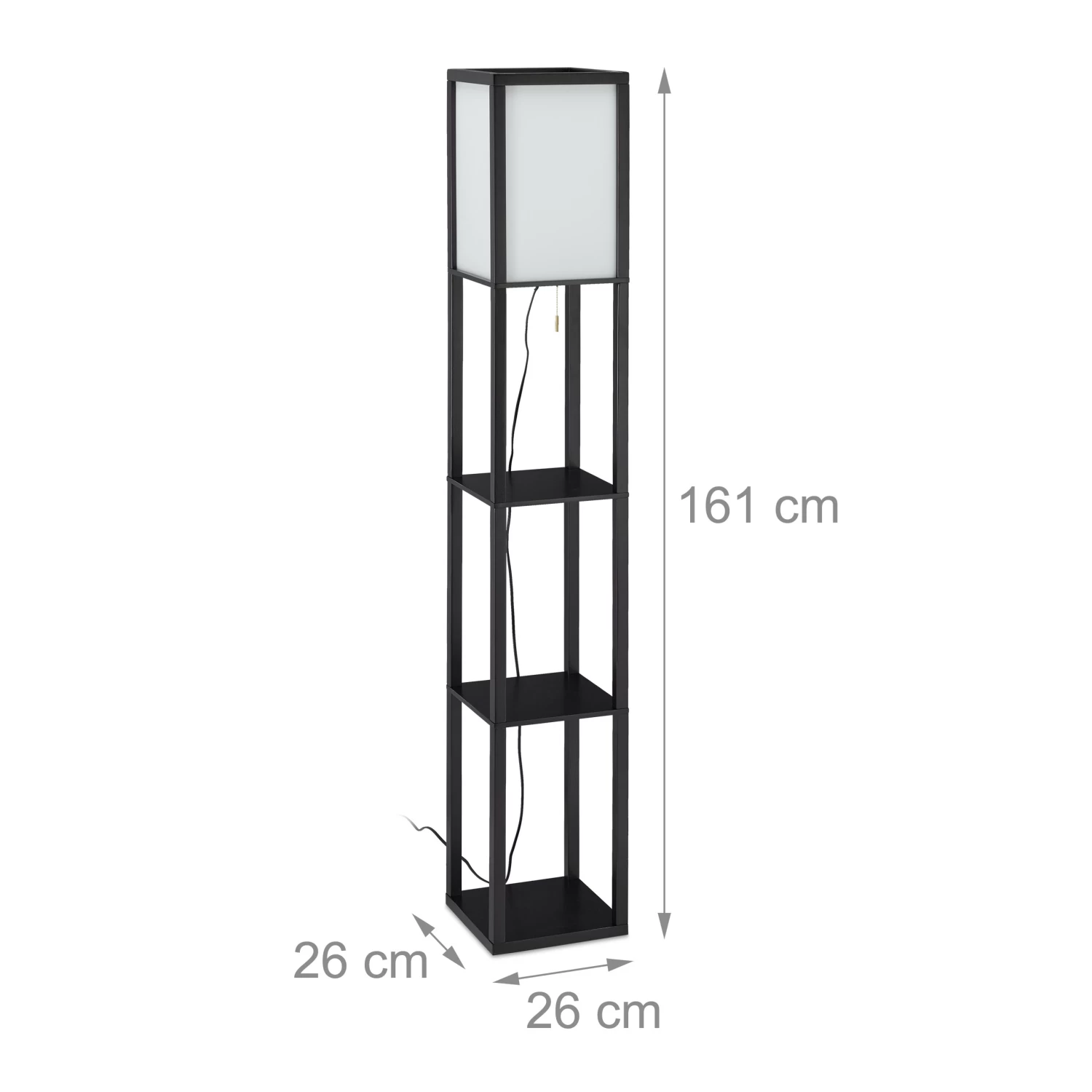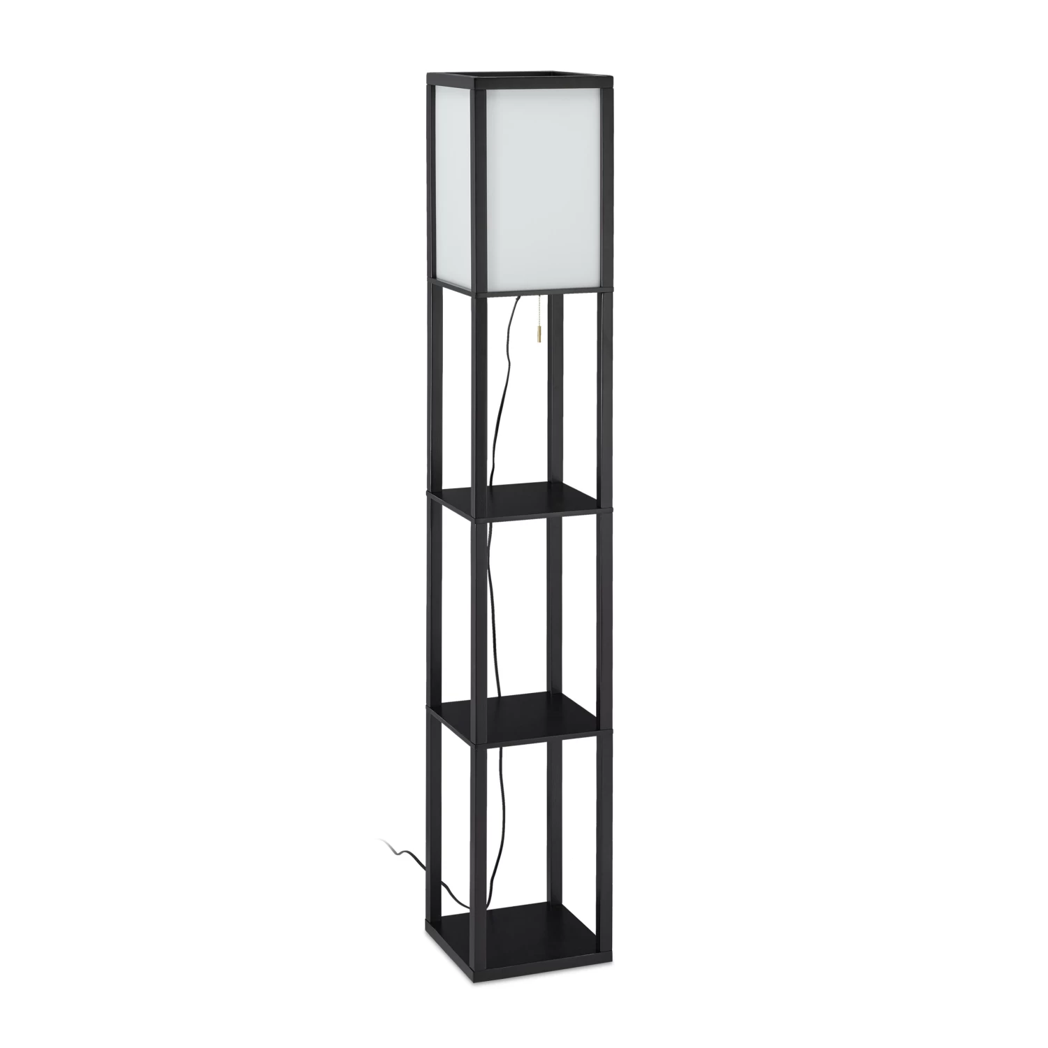 Wenn Sie sich beim TV schauen ein angenehm beleuchtetes Wohnzimmer wünschen, ist die Standlampe mit dem weißen Schirm aus Acryl genau das Richtige für Sie. Absolutes Highlight der Design-Stehlampe sind jedoch die 3 quadratischen Ablagen aus schwarzem Holz. Neben der Couch kann das Regal als Stauraum und Präsentationsfläche für Deko, Bilder, Bücher und Vasen genutzt werden. Ein- und ausgeschaltet wird die Säulenleuchte mit einem Zugschalter. Zudem ist der Aufbau der Lampe im Nu erledigt.