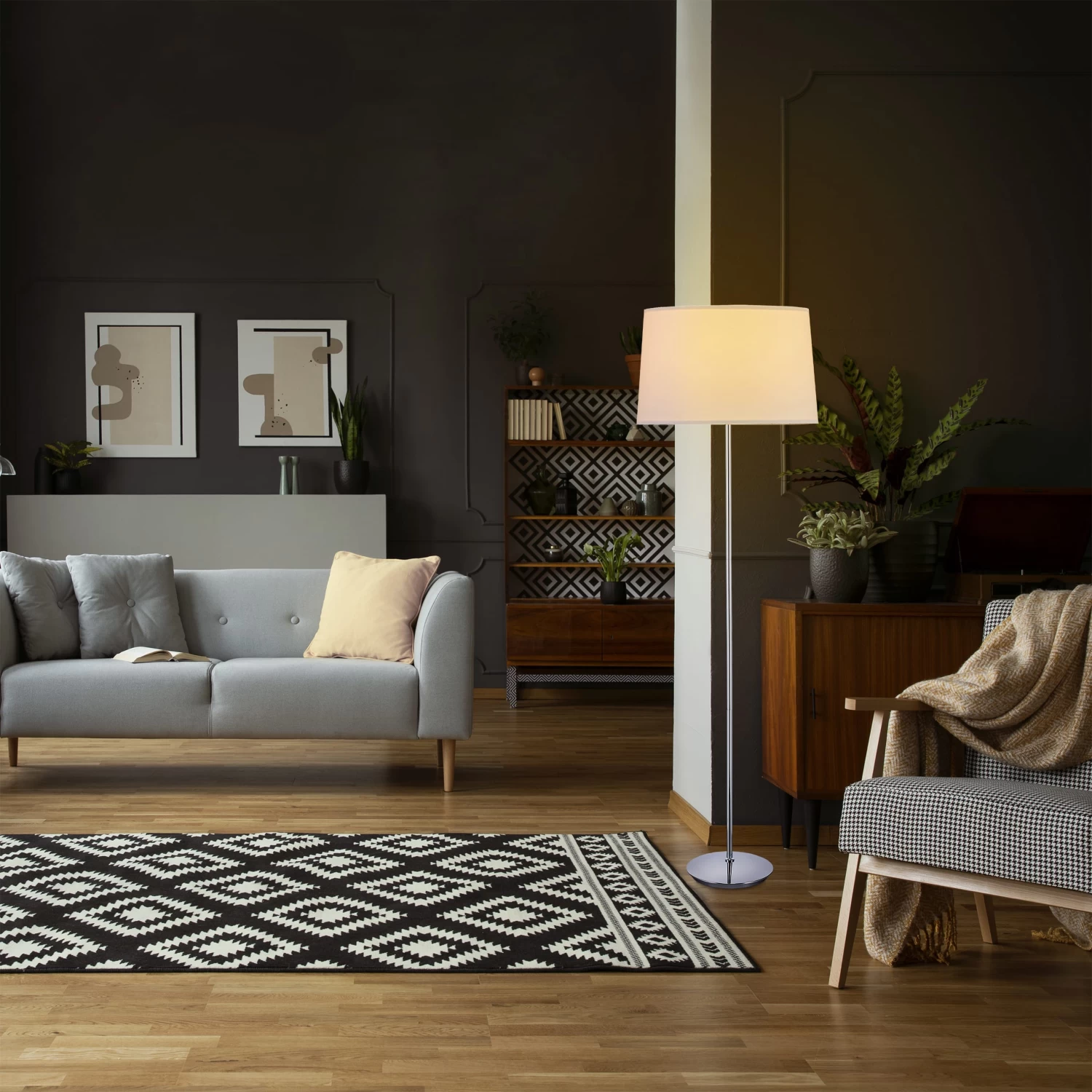 Die Standlampe mit Schirm ist ideal, um das Wohnzimmer stimmungsvoll zu beleuchten oder als Deko Stehleuchte gemütliches Licht im Schlafzimmer zu spenden. Der Lampenschirm aus Stoff sorgt für eine indirekte, angenehme Beleuchtung und bietet einen kontrastreichen Akzent zum glänzenden Chrom-Fuß. Die Stehleuchte fügt sich mit ihrem klassischen Design bestens in Ihre Stube ein und ist dank des langen Kabels mit einem praktischen Fußschalter leicht ein- und auszuschalten.