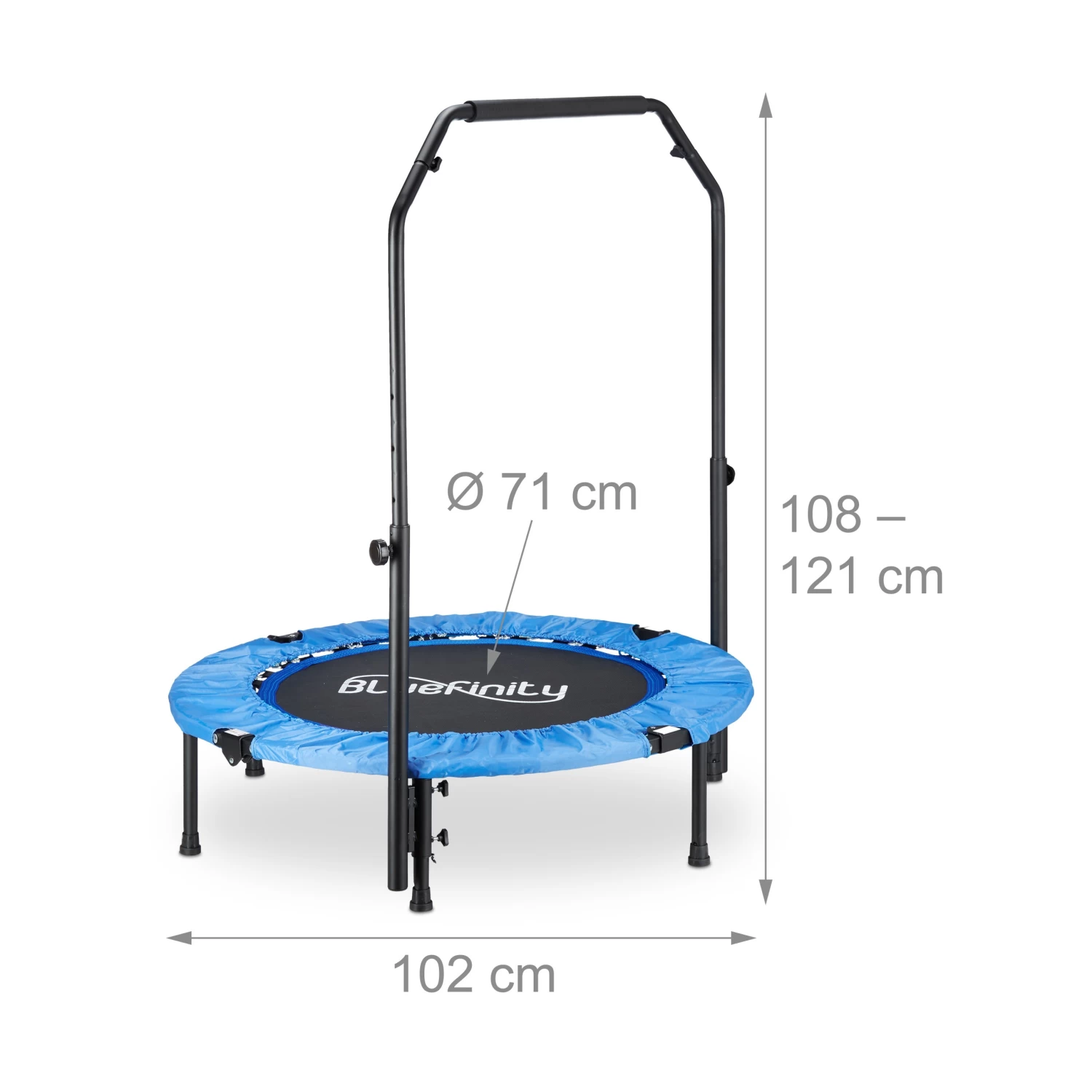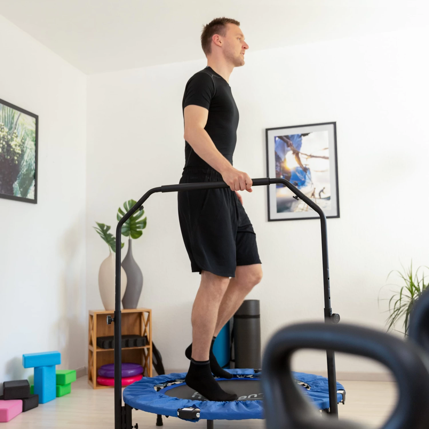 Wenn Sie nach Feierabend keine Lust mehr auf einen Besuch im Fitnessstudio haben, ist dieses Trampolin der passende Mitstreiter für Sie. Dank der höhenverstellbaren Stange können Sie sich beim Springen festhalten. Ordentlich ins Schwitzen kommen Sie darüber hinaus mit den 2 Expandern, die Sie für zahlreiche Übungen verwenden können. Das Minitrampolin lässt sich zusammenfalten und damit nach dem Gebrauch platzsparend aufbewahren. Dank der praktischen Tragetasche stellt sowohl die Lagerung als auch der Transport des Fitnesstrampolins kein Problem dar.