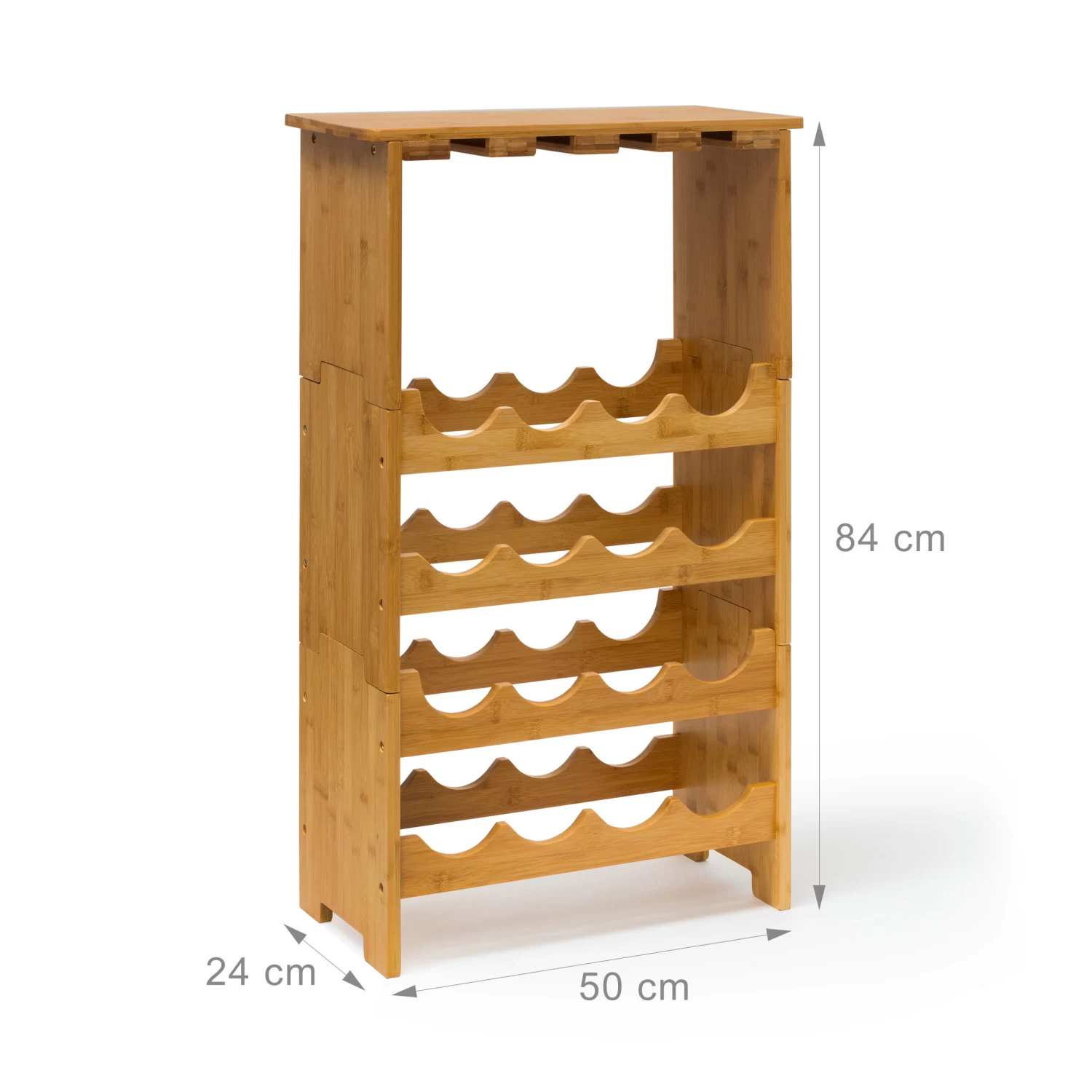 Dieses edle Weinregal aus Bambusholz ist Platzwunder und Blickfang gleichermaßen. Es verfügt über 4 Etagen, auf denen jeweils 4 Flaschen Wein Platz finden. Da diese waagerecht liegen, bleiben die Korken feucht und der Inhalt luftdicht verschlossen. An der Deckenplatte des Regals können bis zu 12 Weingläser kopfüber eingehängt werden.
