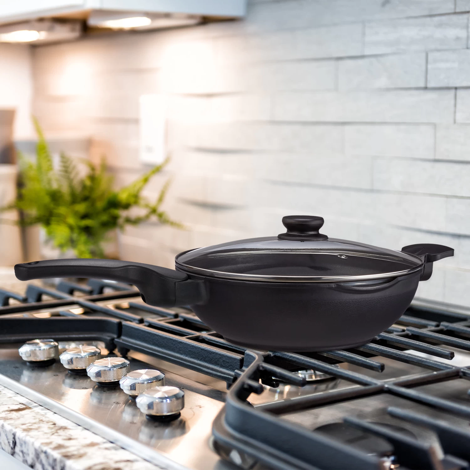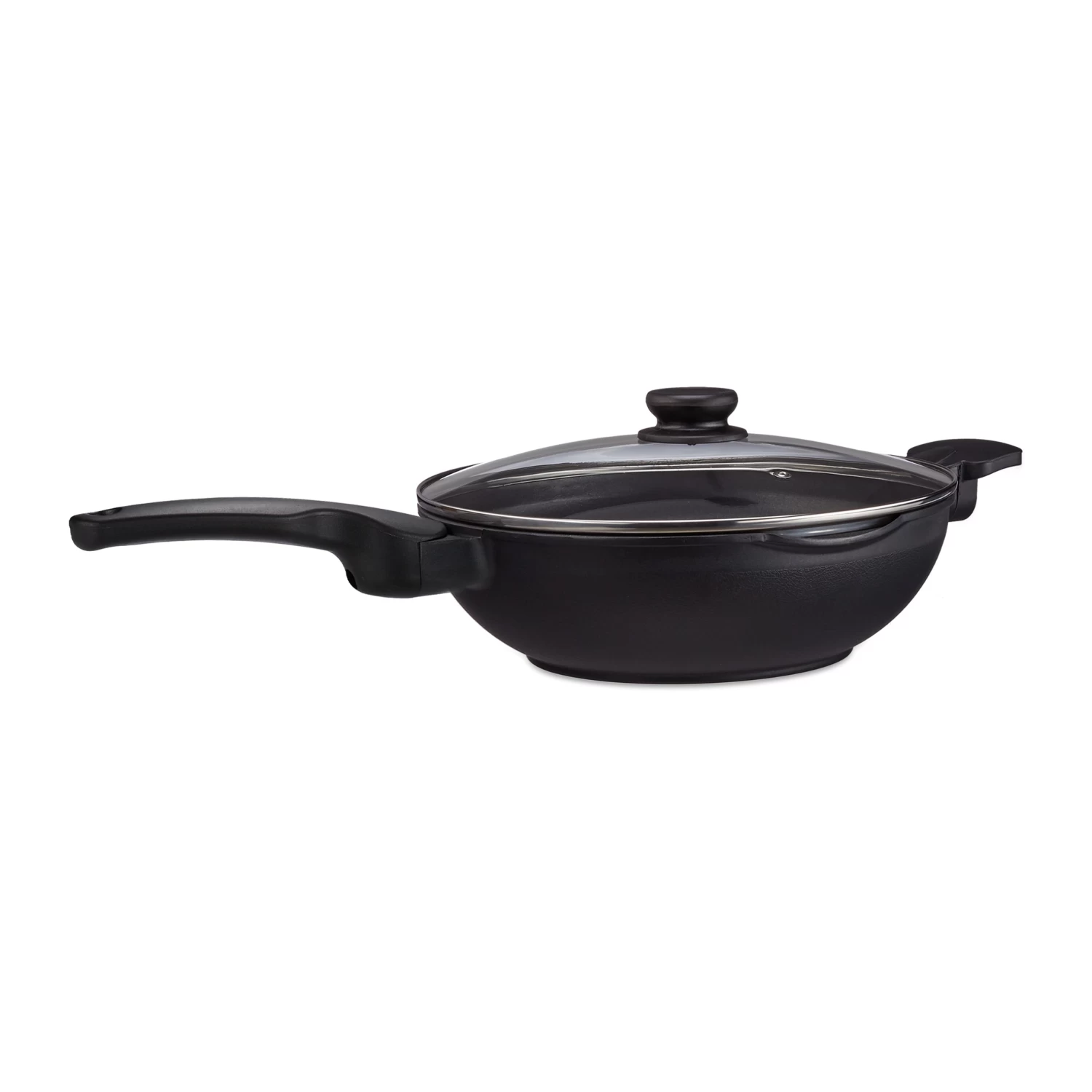 – Schwarze Pfanne mit durchsichtigem Deckel